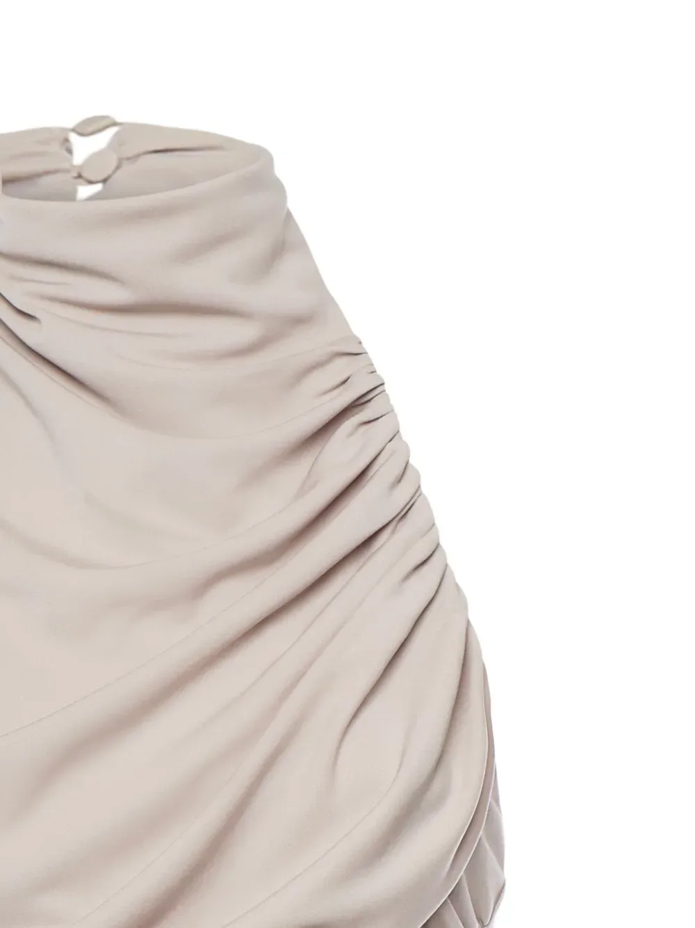 Светло-серый цвет, драпировка, воротник-хомут, открытая спина, бахрома по краю, застежка на пуговицу сзади