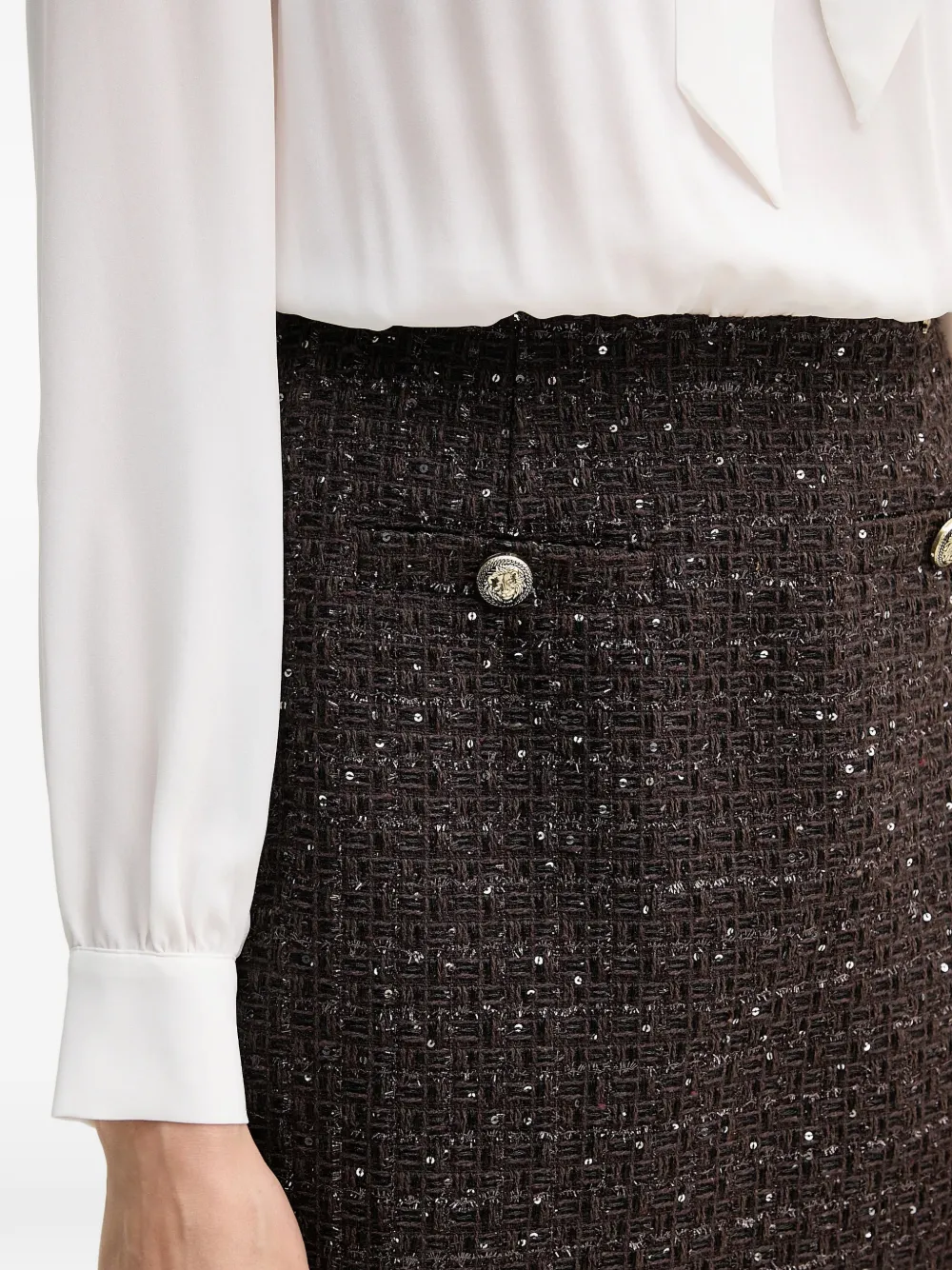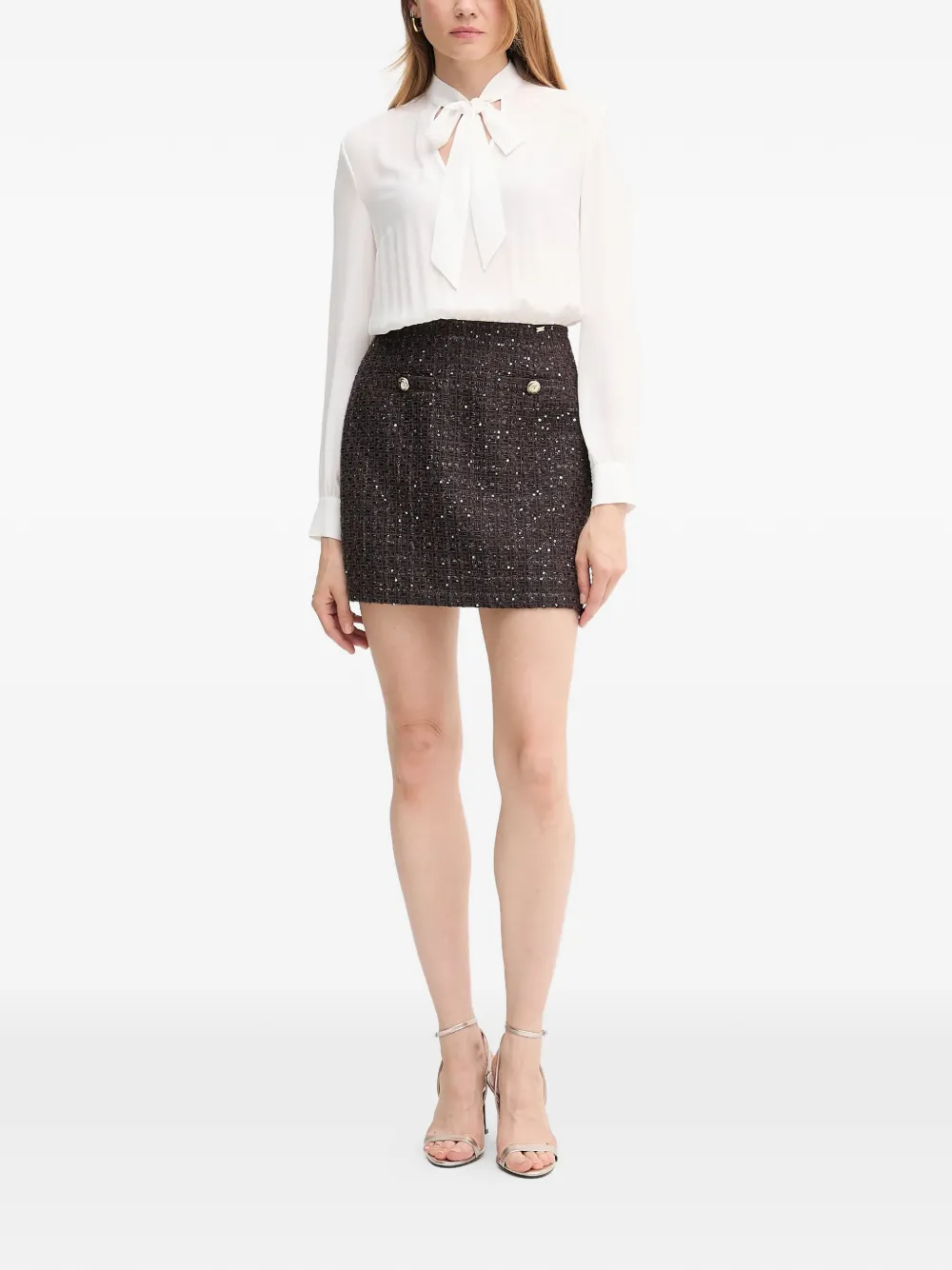 Белая и коричневая текстурированная отделка, бант на воротнике, декоративные пуговицы, приталенный силуэт