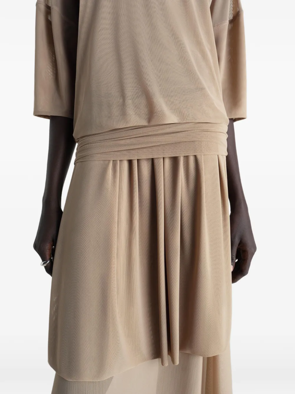 Светло-бежевый полупрозрачный сетчатый материал, драпировка на талии, короткие рукава, многослойная юбка