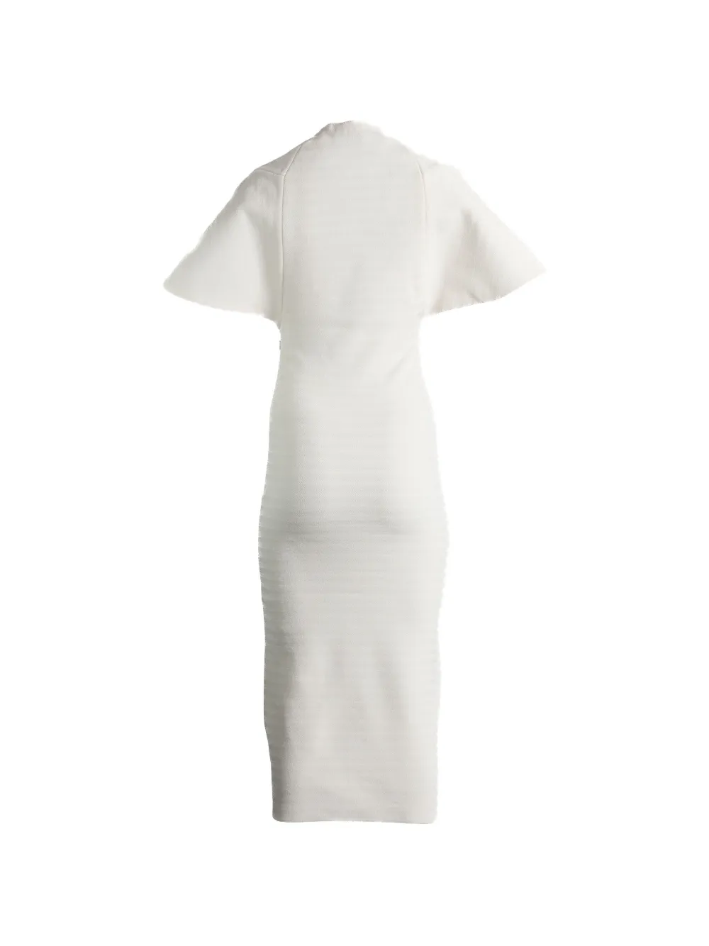 Белая текстурированная отделка, V-образный вырез, короткие широкие рукава, прямой подол, средняя длина