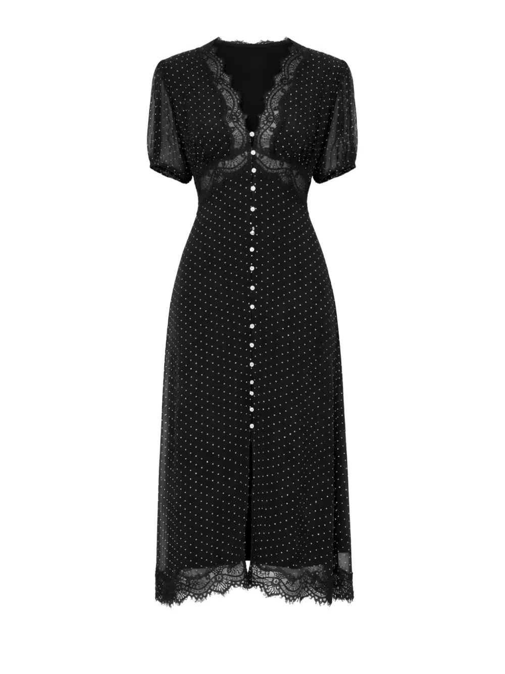 Черный в горошек, кружевная отделка, рукава с объемом, застежка на пуговицы спереди, V-образный вырез