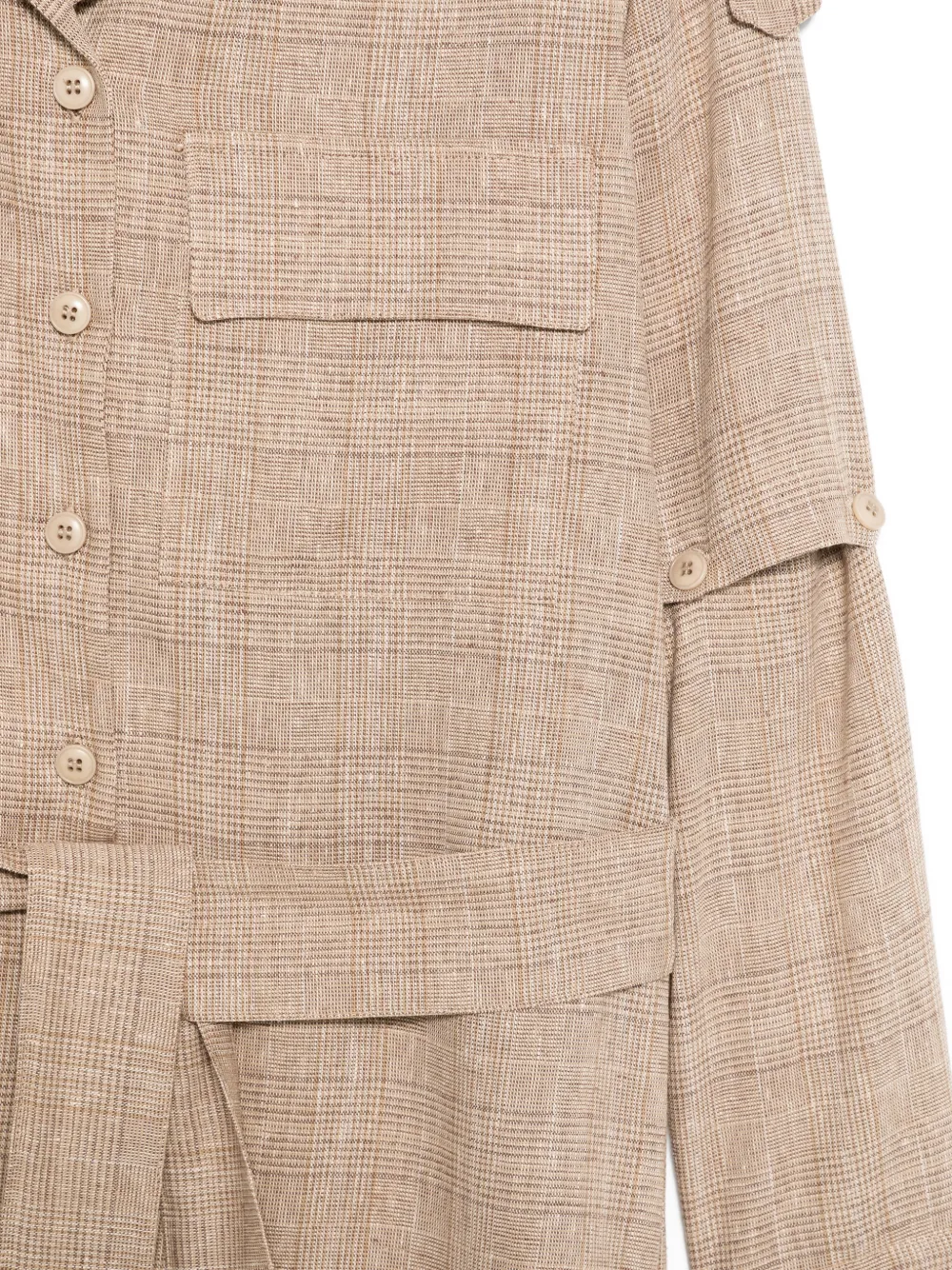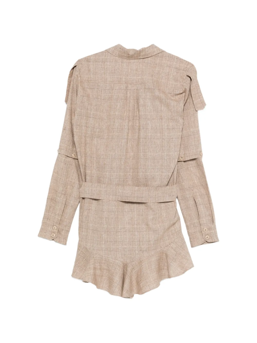 Бежевый цвет, клетчатый узор, оборка по низу, пояс, застежка на пуговицы, накладные карманы спереди