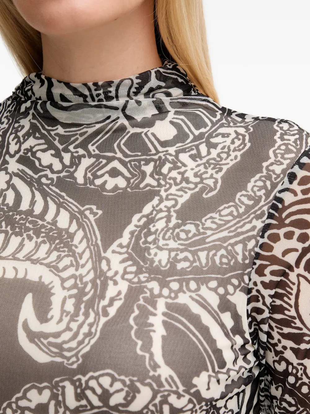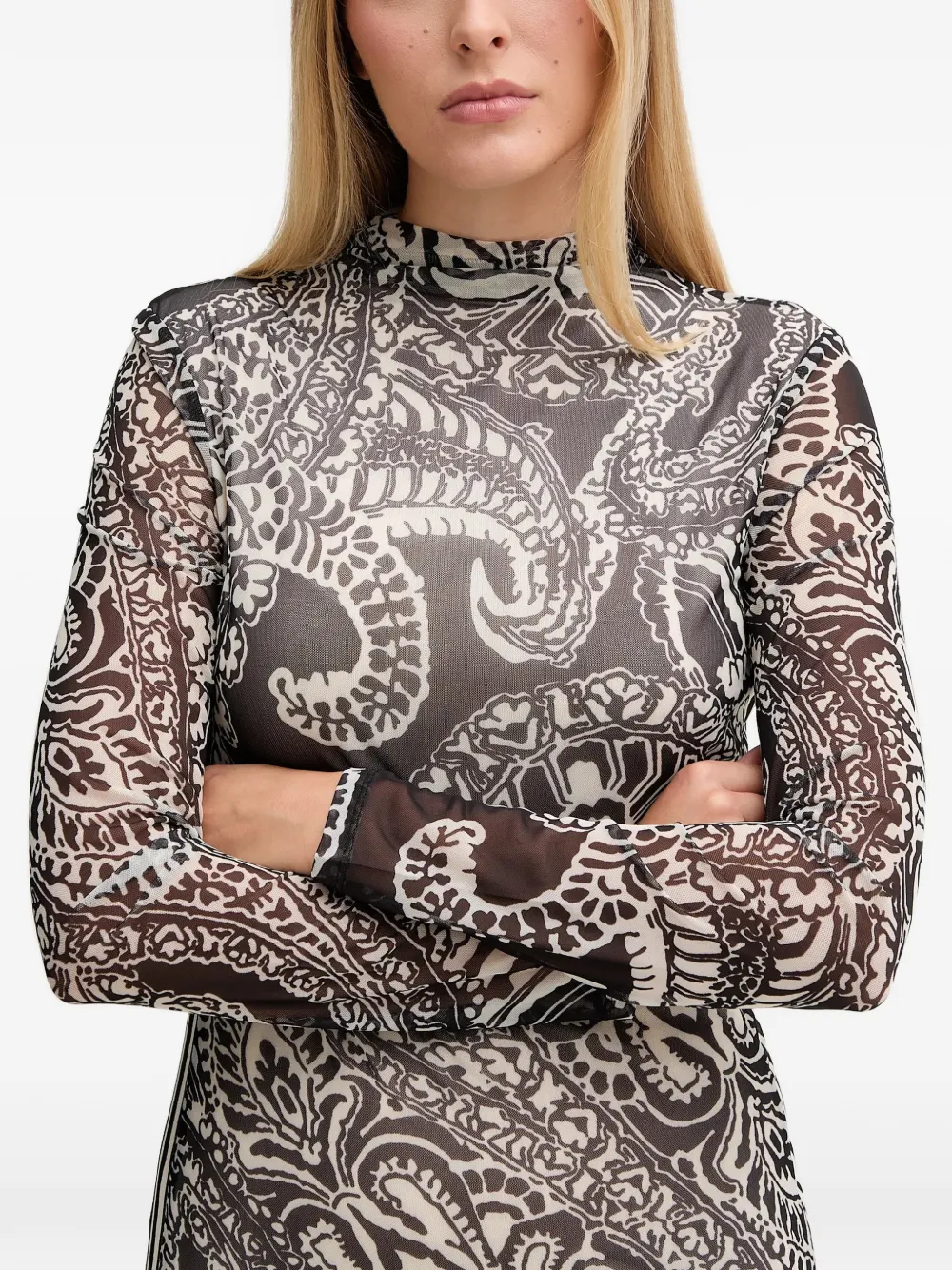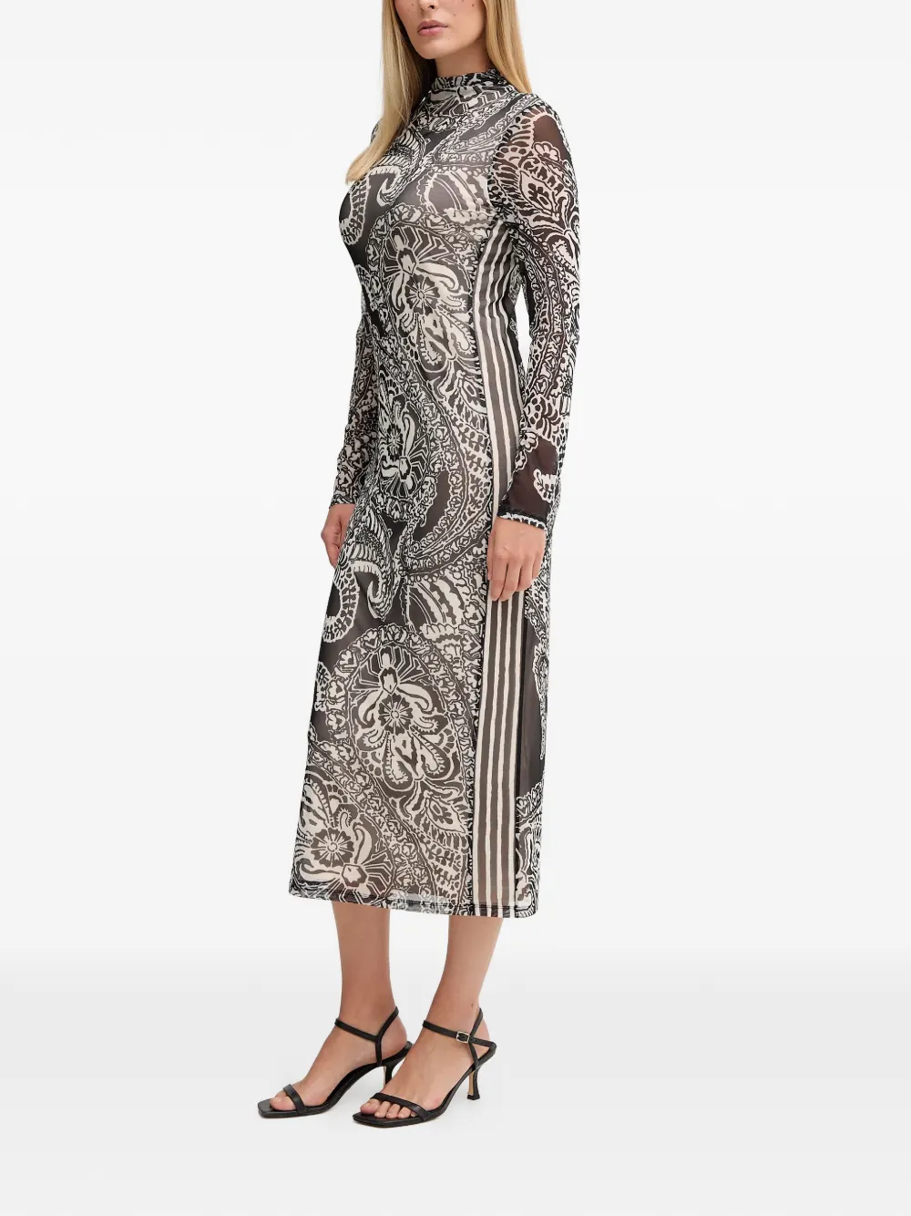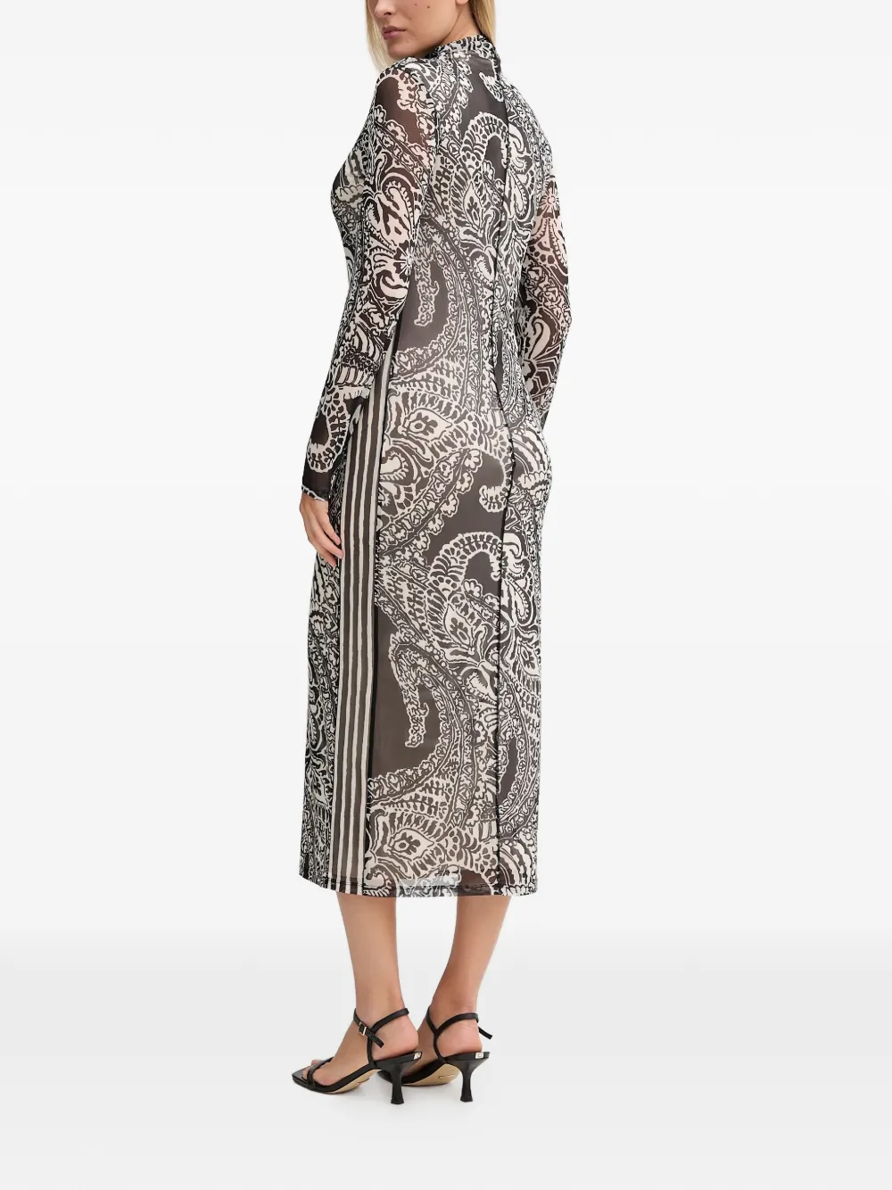 Черно-белый узор по всей поверхности, воротник-стойка, длинные рукава, боковые полосы, длина миди