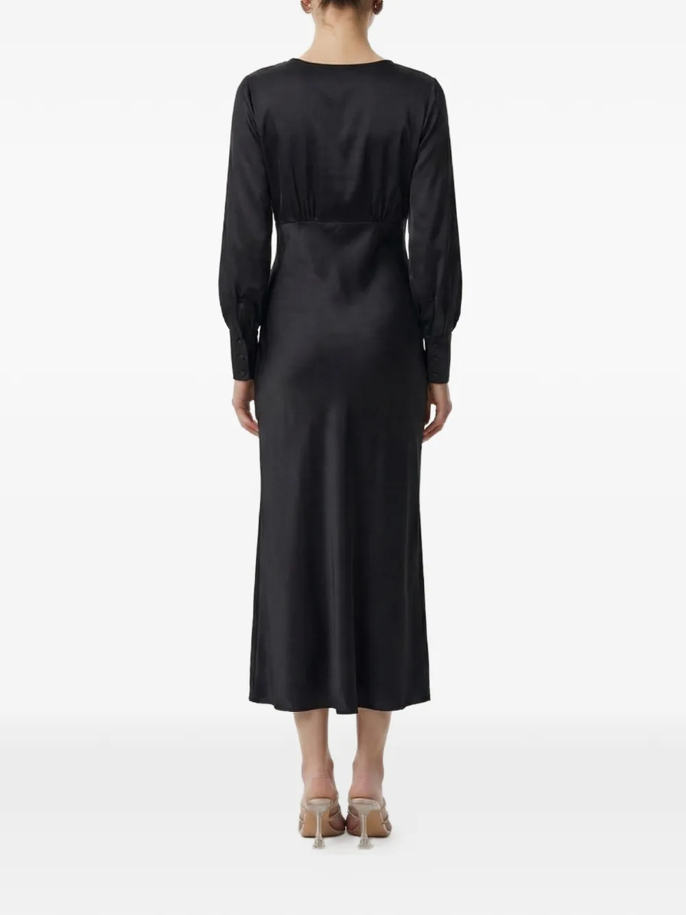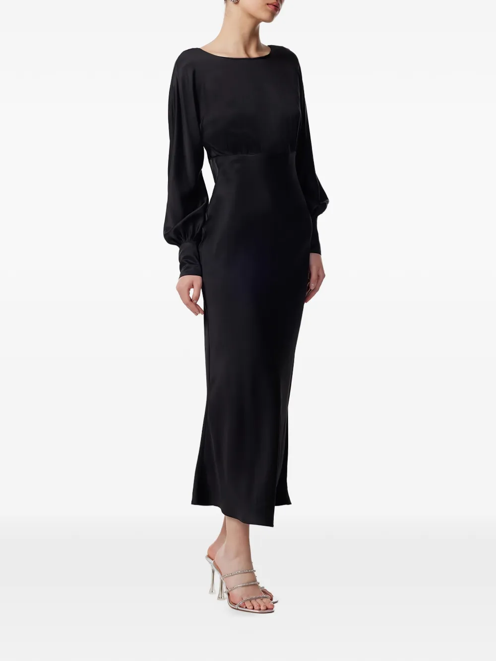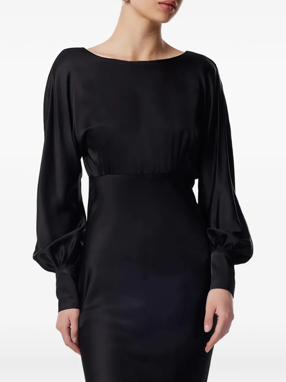 Черные рукава-буфы, застежка на пуговицу сзади, задний вырез-капля, приталенный крой, длина миди