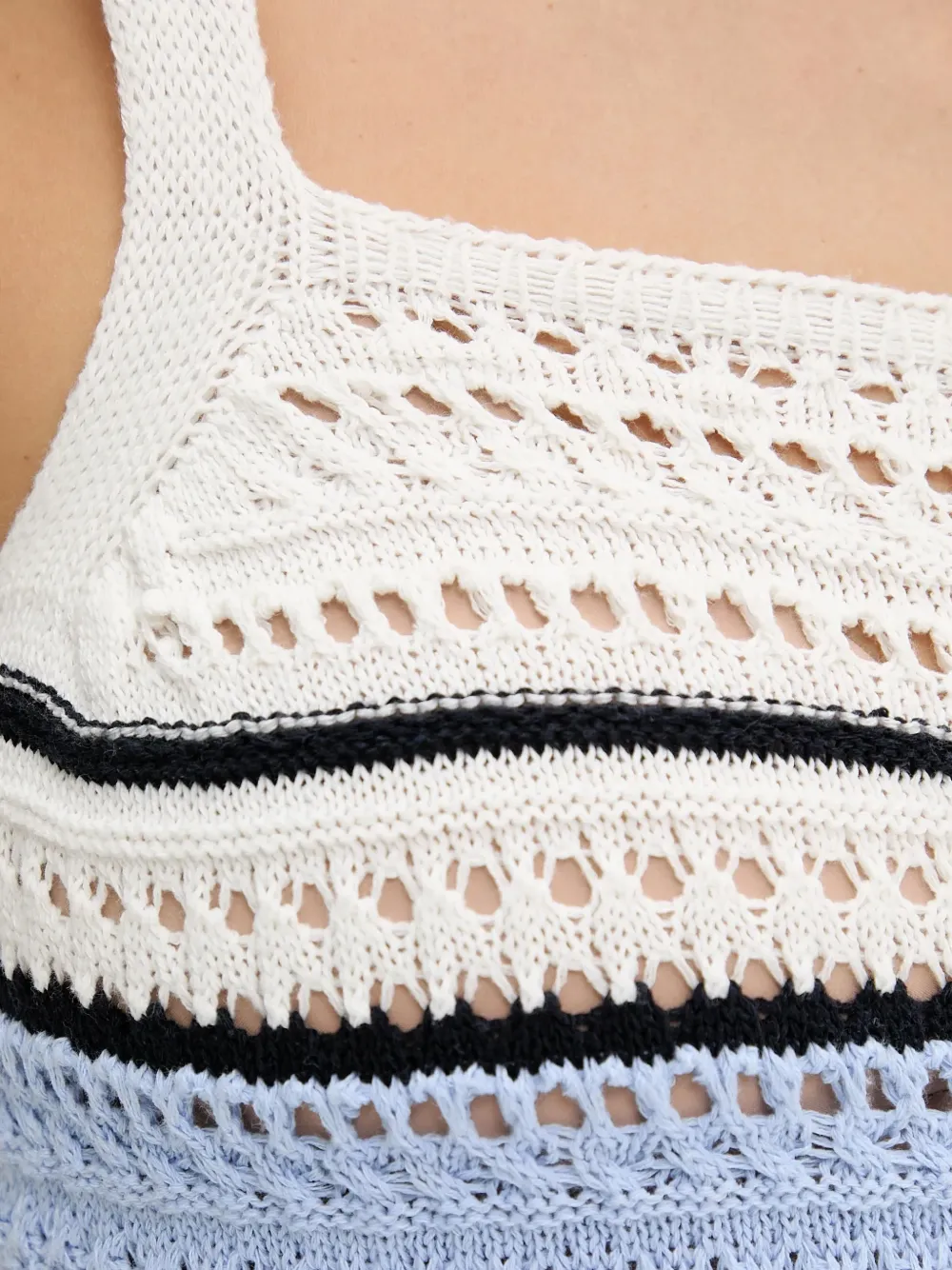 Белое и синее в полоску, с вязаными деталями, квадратным вырезом, без рукавов, приталенный фасон