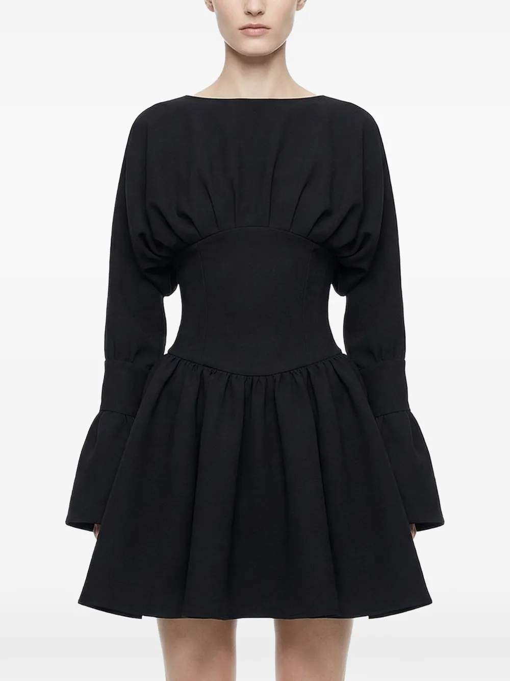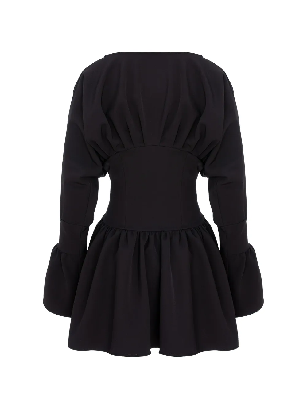 Черный с длинными рукавами, приталенный силуэт, расклешенные манжеты, сборки, расклешенная юбка