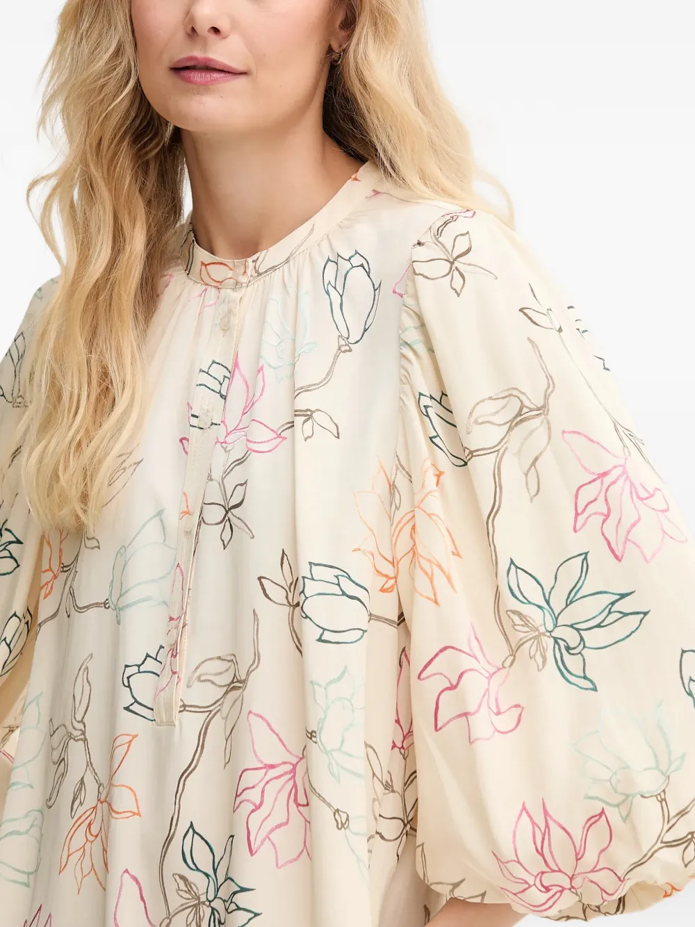 Бежевый цветочный принт, рукава 3/4, боковые карманы, застежка на пуговицах, присборенный вырез