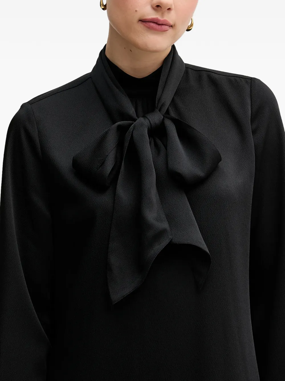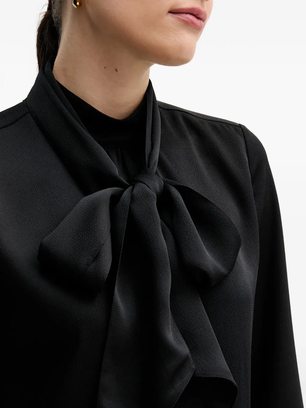 Черный топ с бантом, длинными рукавами, застежками на пуговицах на манжетах и круглым вырезом