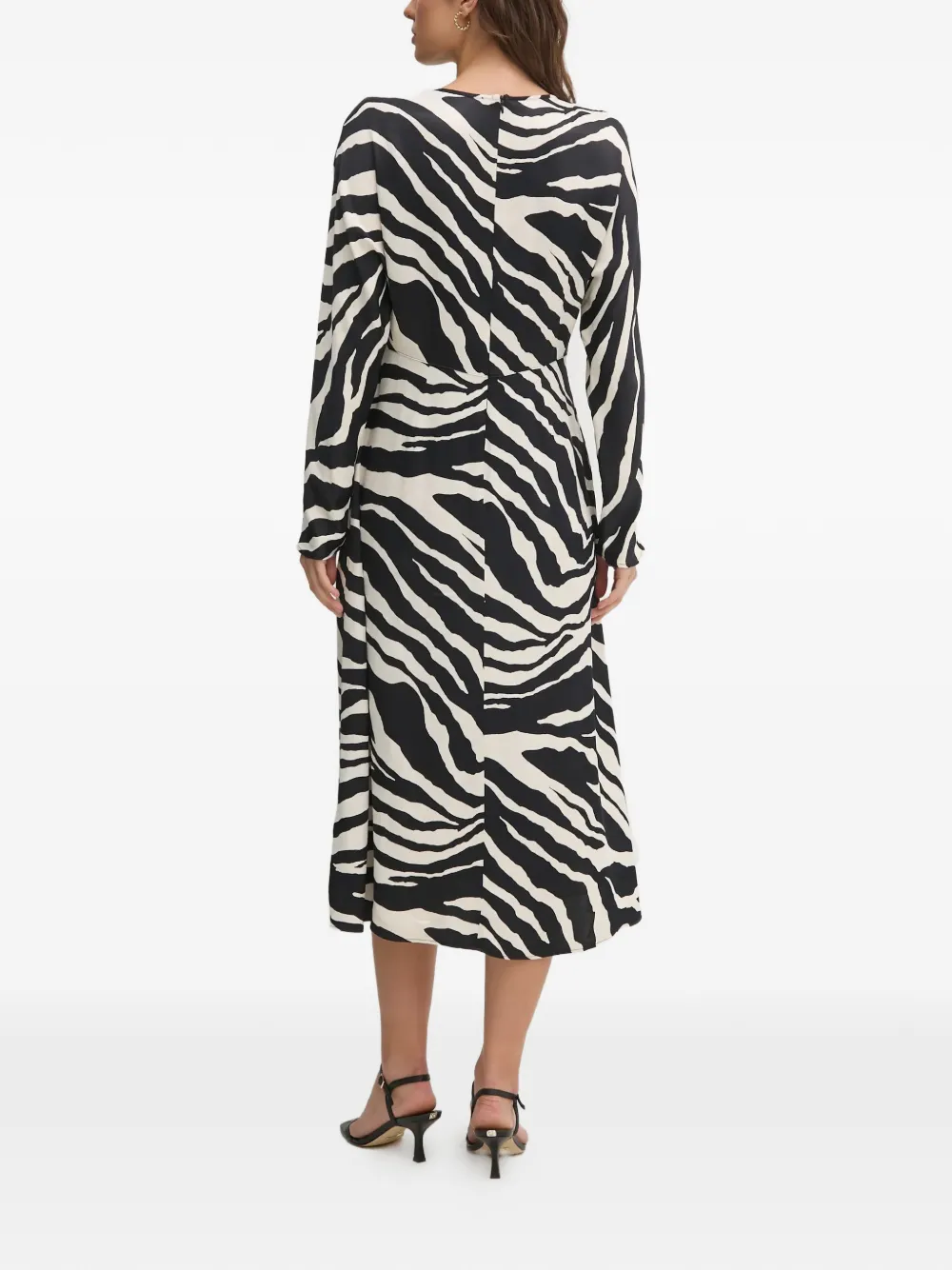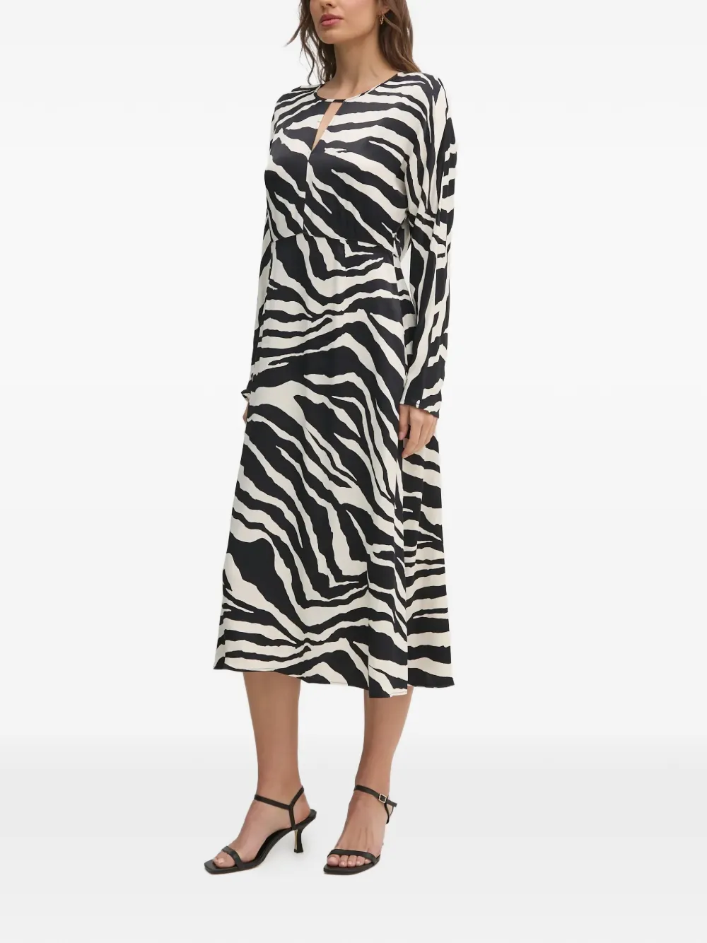 Черное платье средней длины с принтом "зебра", вырезами, длинными рукавами и круглым вырезом
