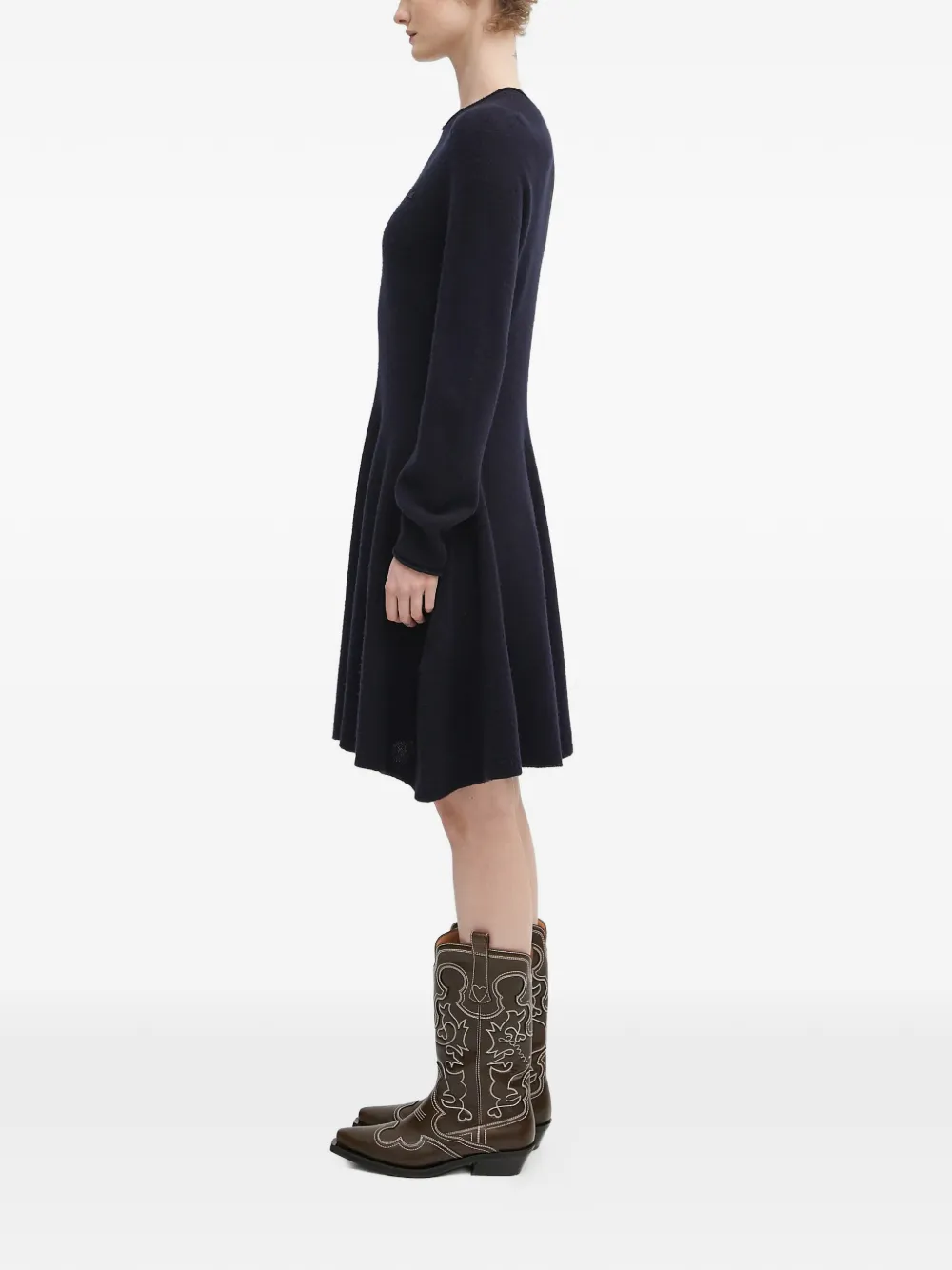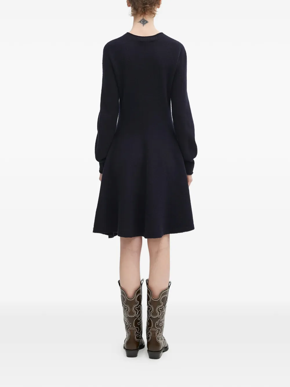 Темно-синее фактурное вязаное платье А-силуэта с круглым вырезом и нашивкой с логотипом