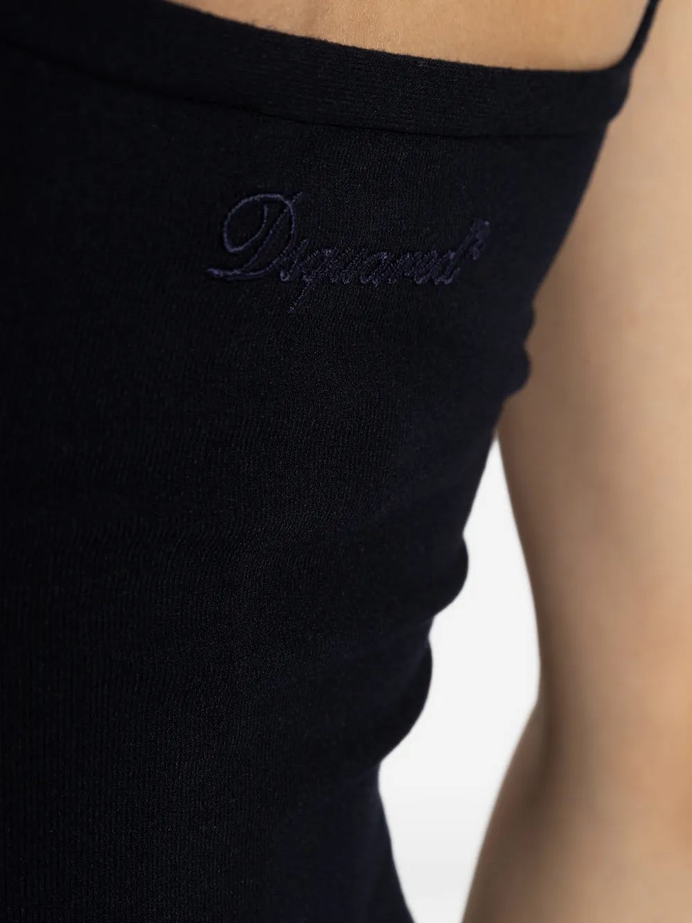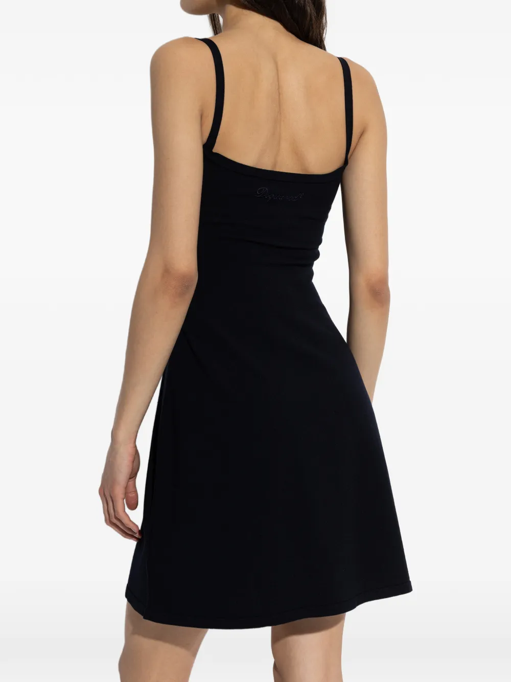 Черное платье с вышитым логотипом, квадратным вырезом, без рукавов и расклешенной юбкой