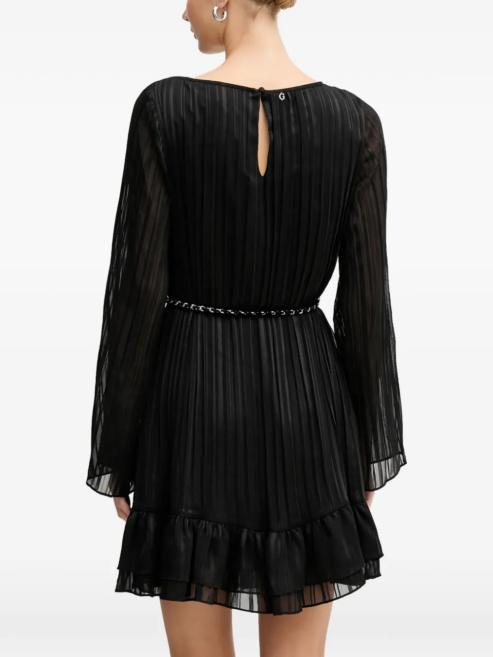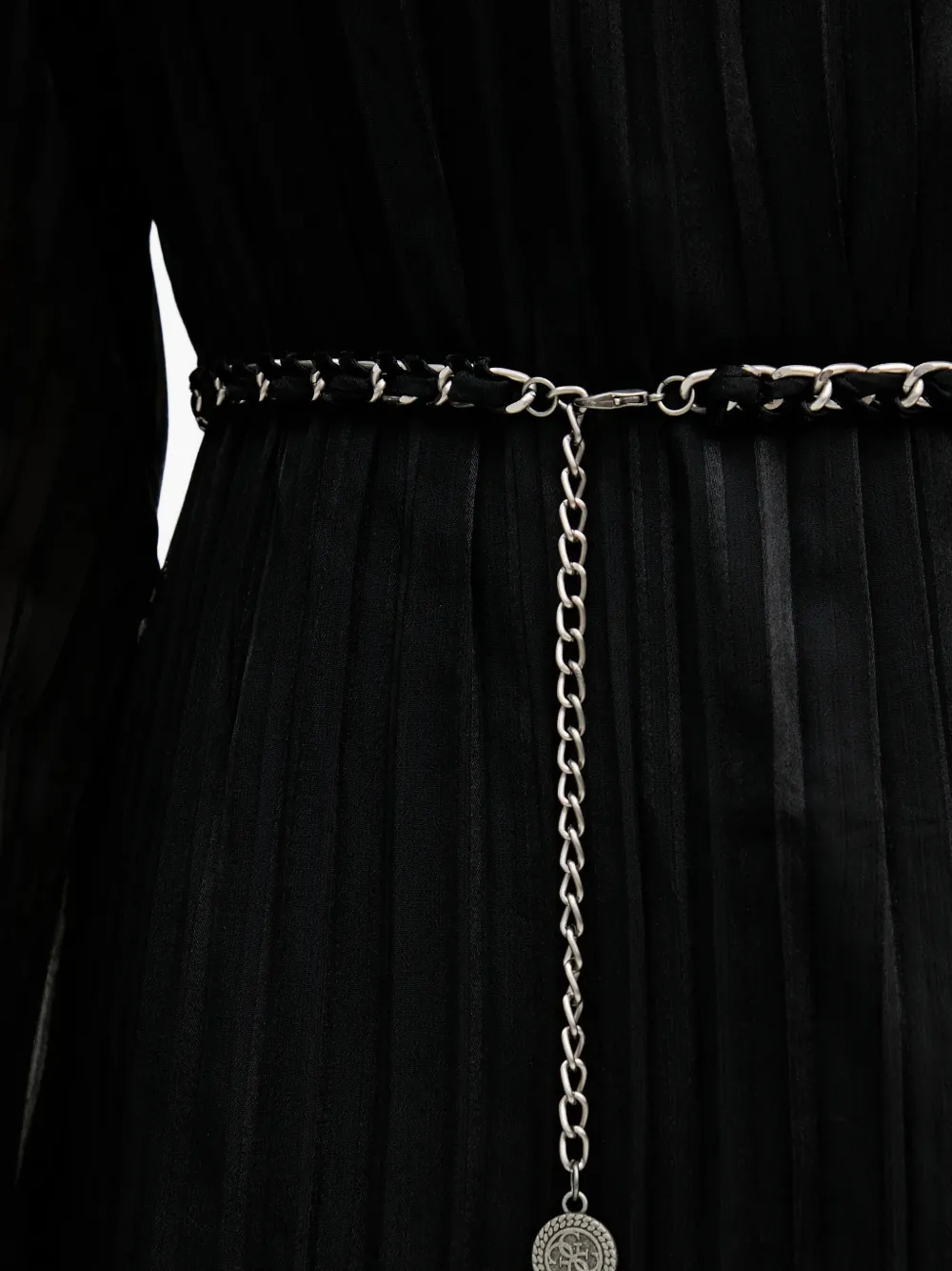 Черный пояс-цепочка, застежка на пуговицы сзади, длинные рукава, плиссированный дизайн