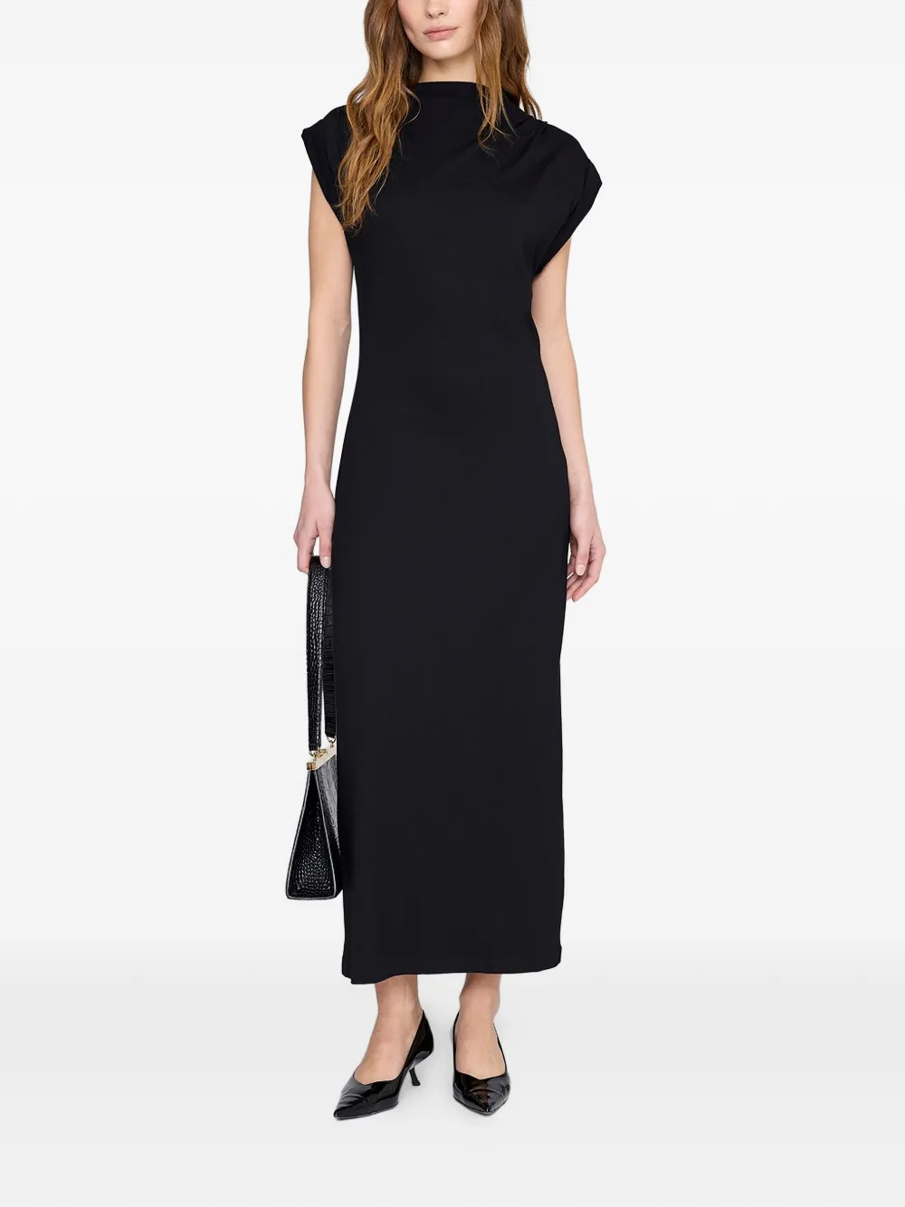 Черные подплечники, воротник-стойка, короткие рукава, макси-длина, прилегающий силуэт