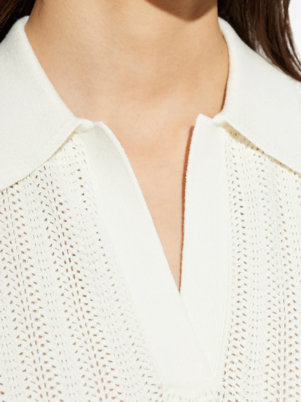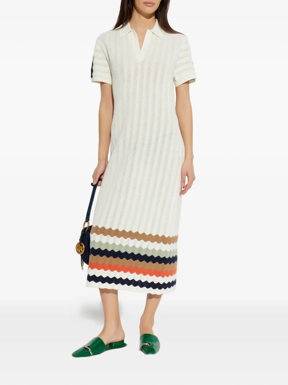 Белый хлопковый трикотаж с полосатым подолом, V-образным вырезом и короткими рукавами