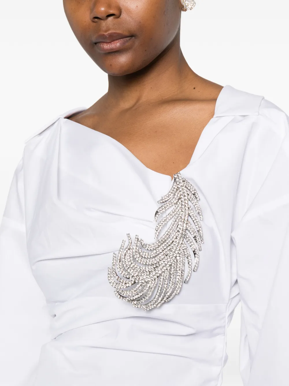 Белая брошь, украшенная кристаллами, асимметричный подол, длинные рукава, драпировка