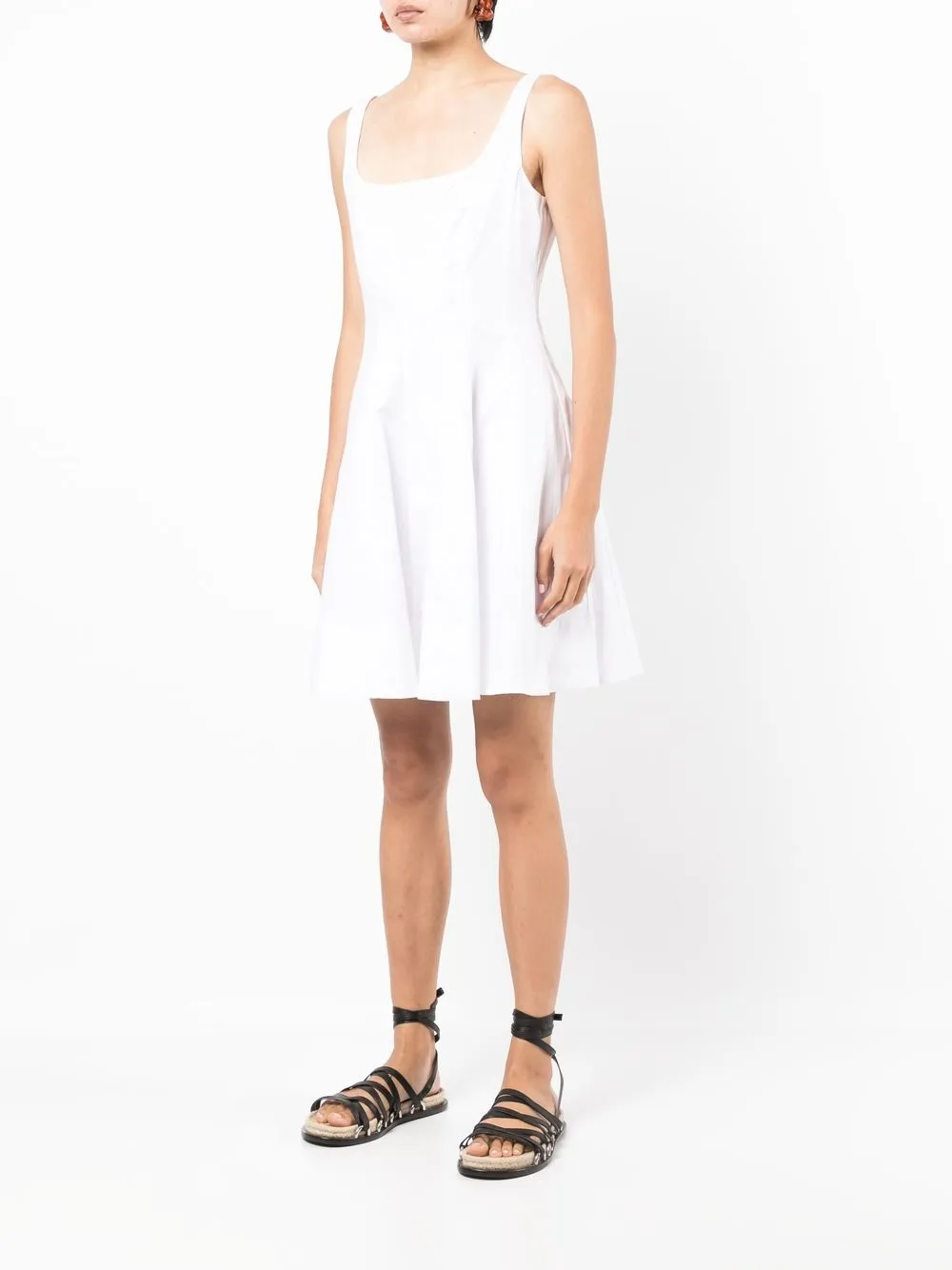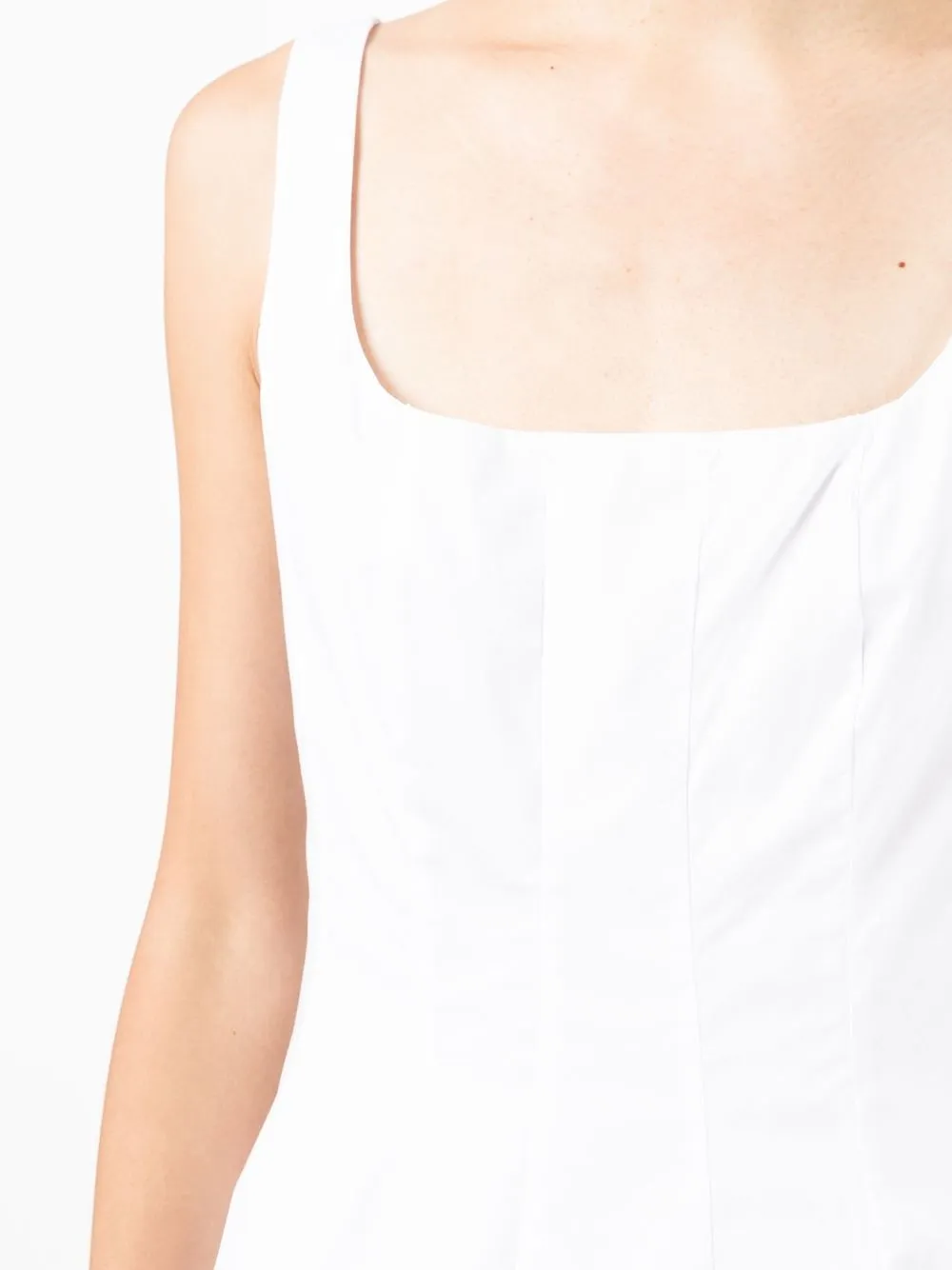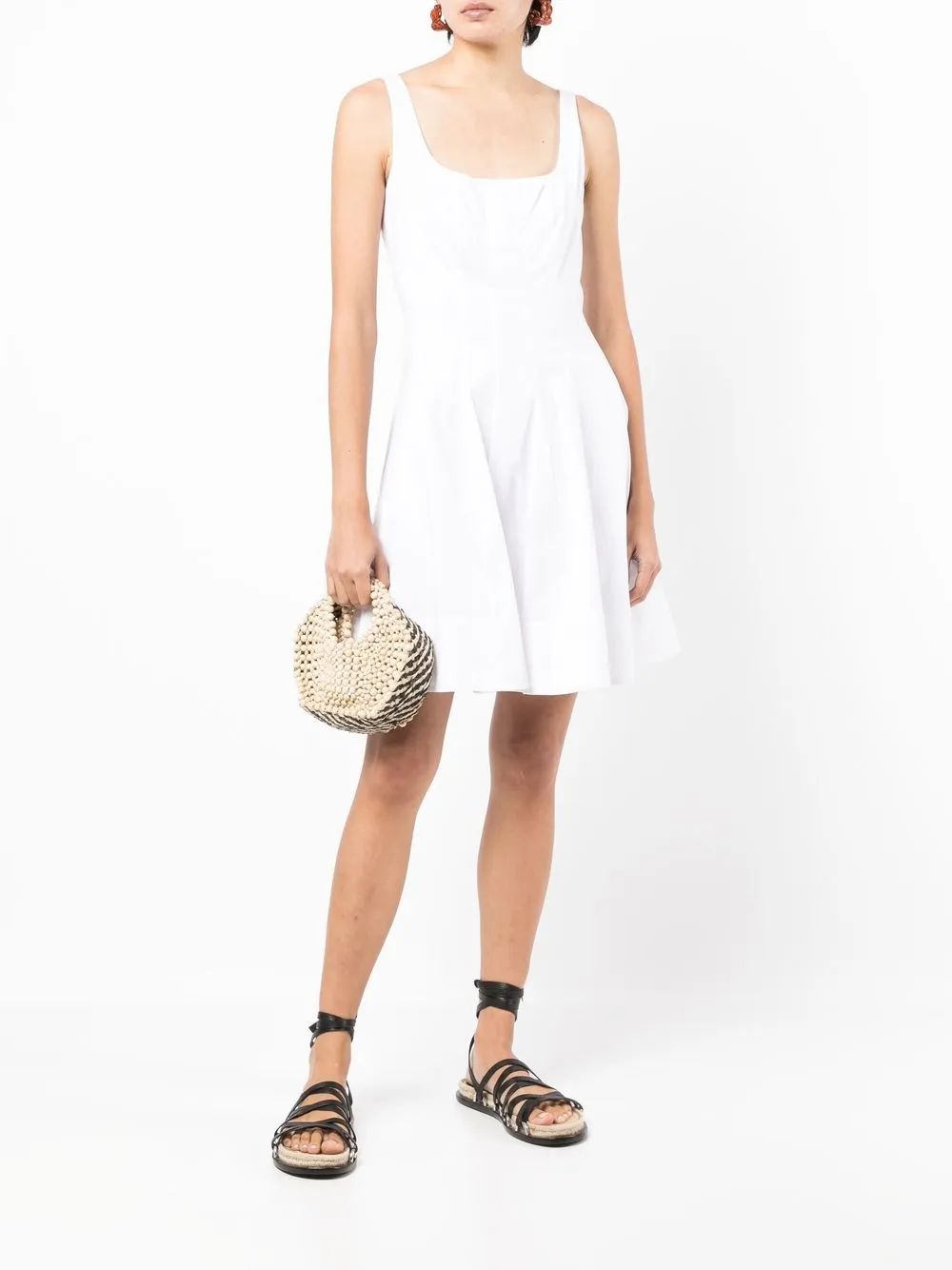 Белый, смесовый хлопок, складки, квадратный вырез, без рукавов и расклешенная юбка.