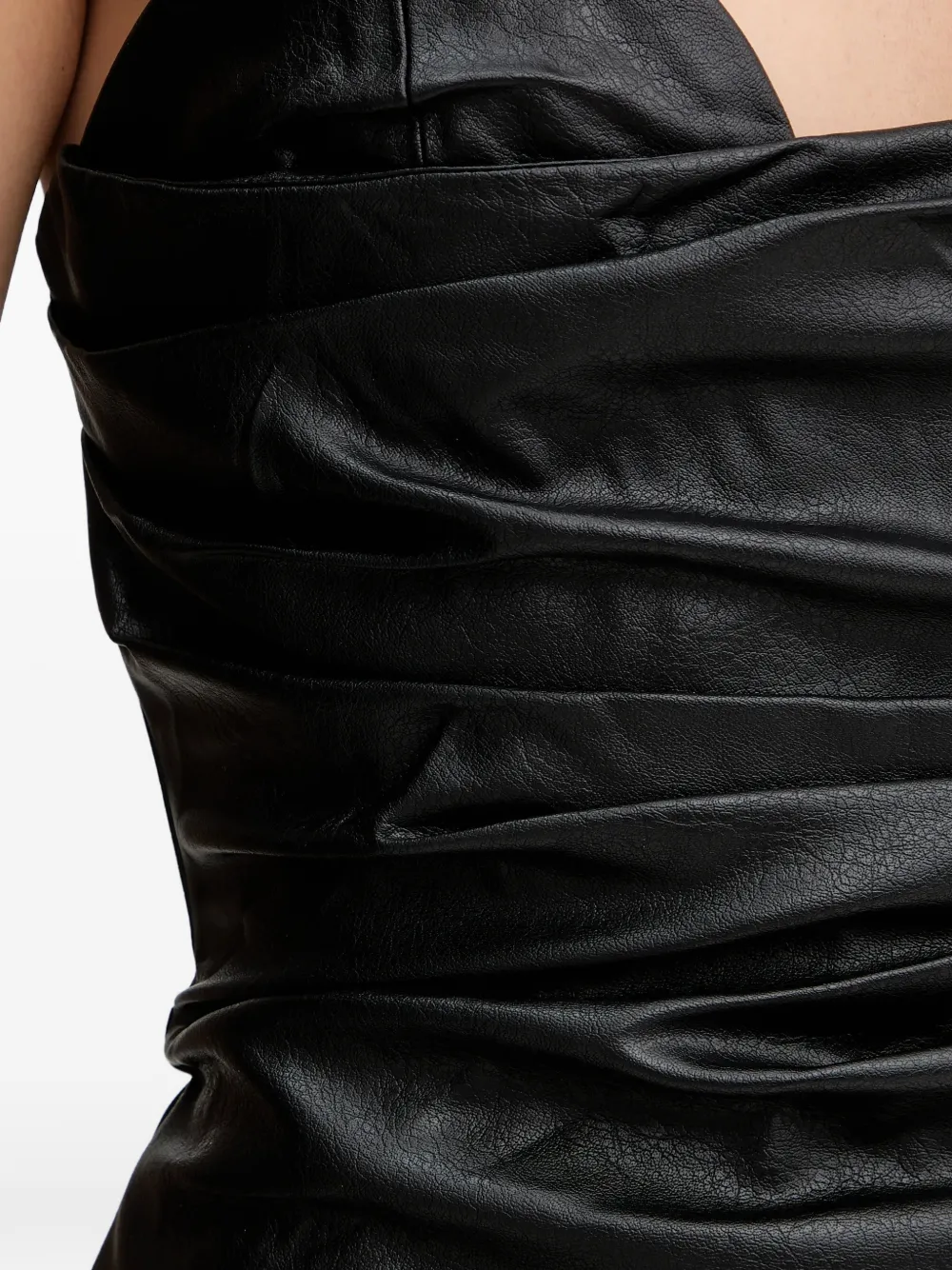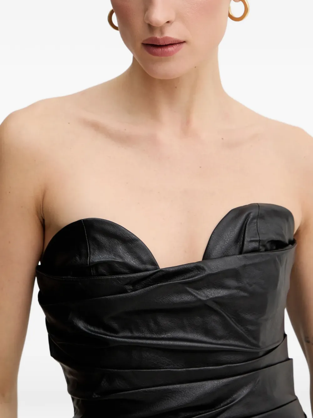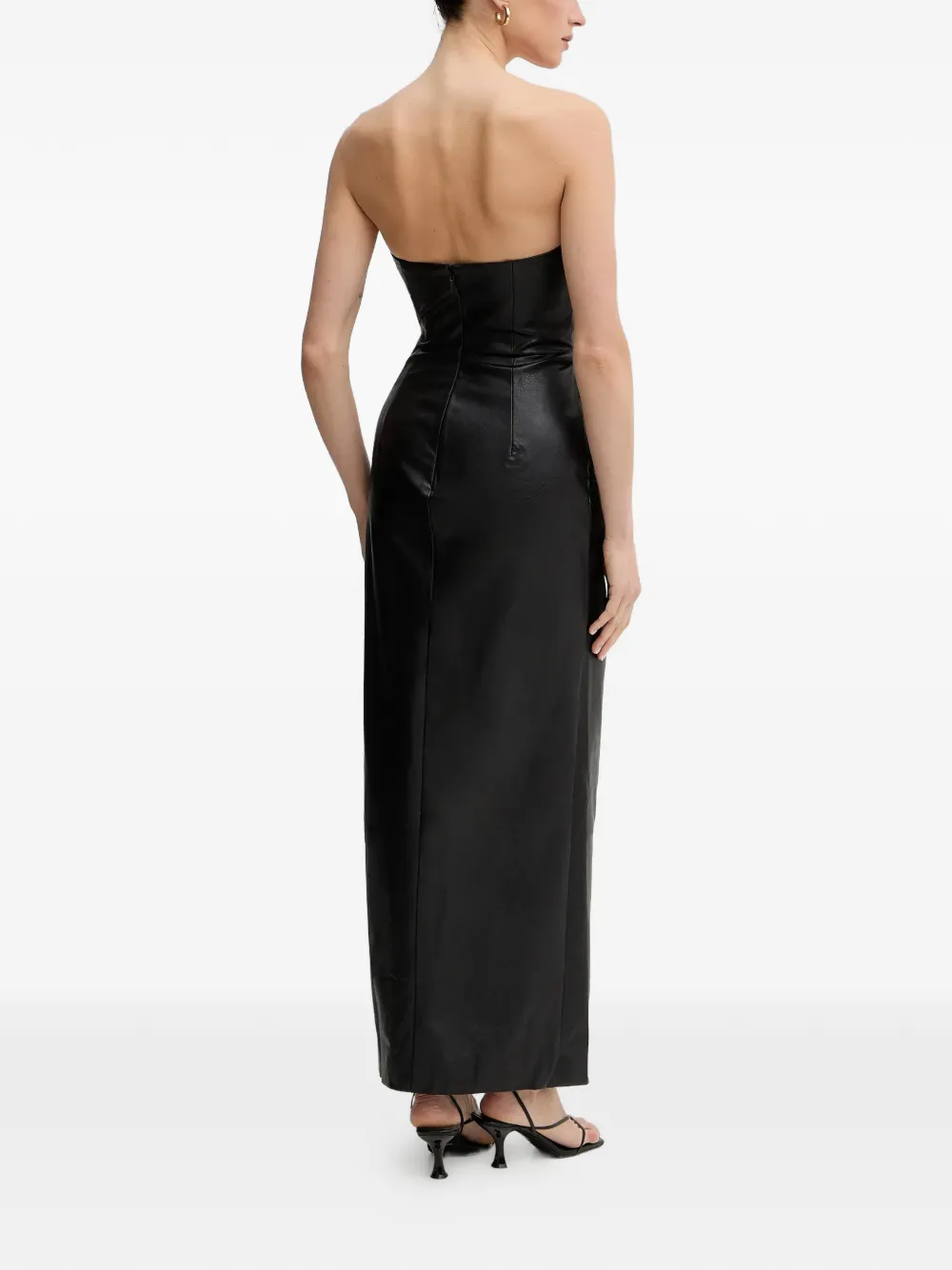Черное платье без бретелек с драпировкой, разрезом сбоку и застежкой-молнией сзади