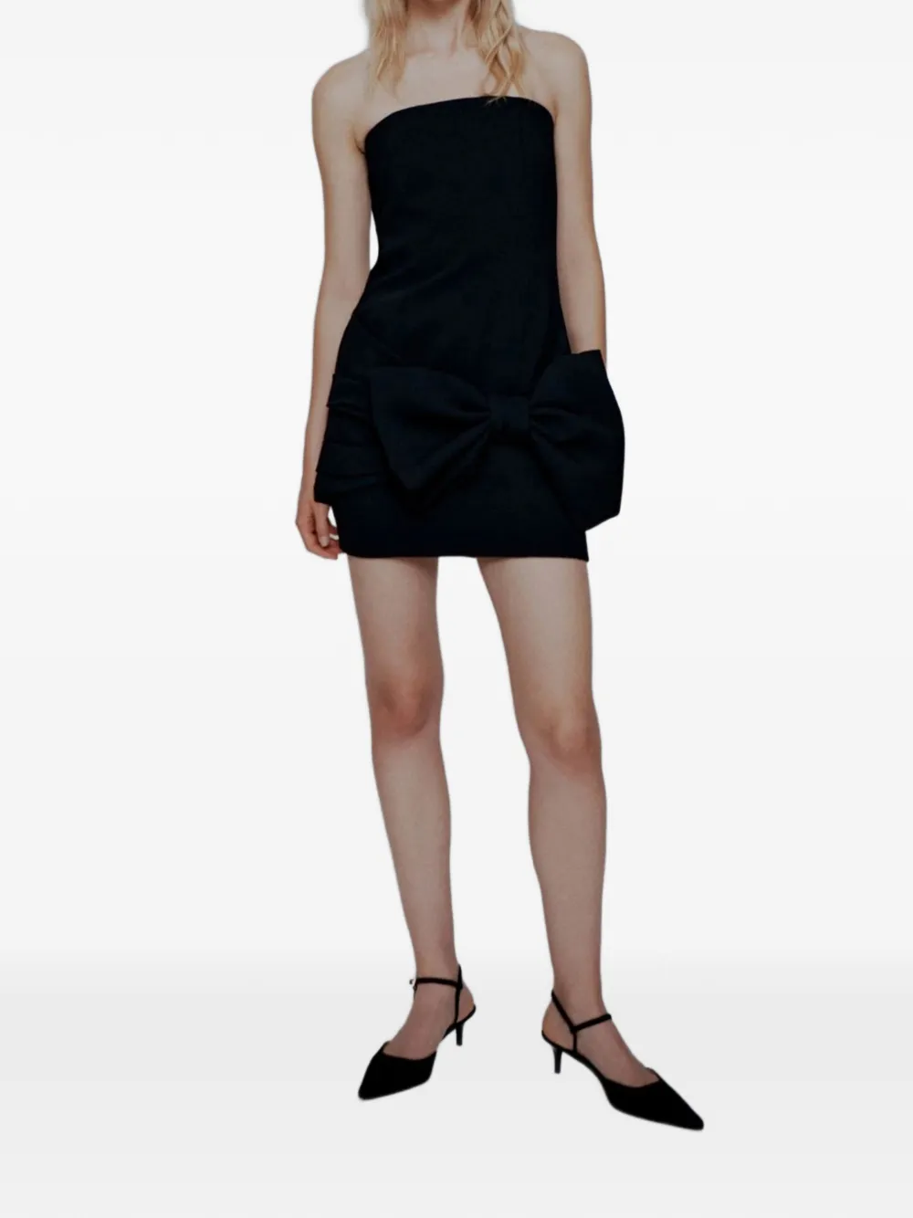 Черное платье без бретелек с бантом, драпировкой, мини-длины, на застежке-молнии