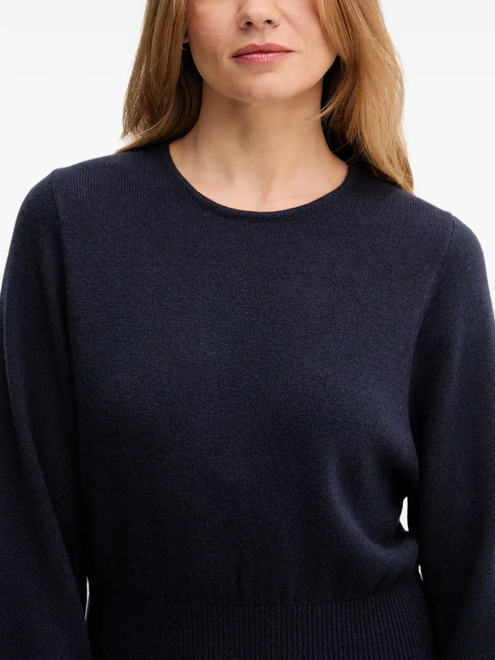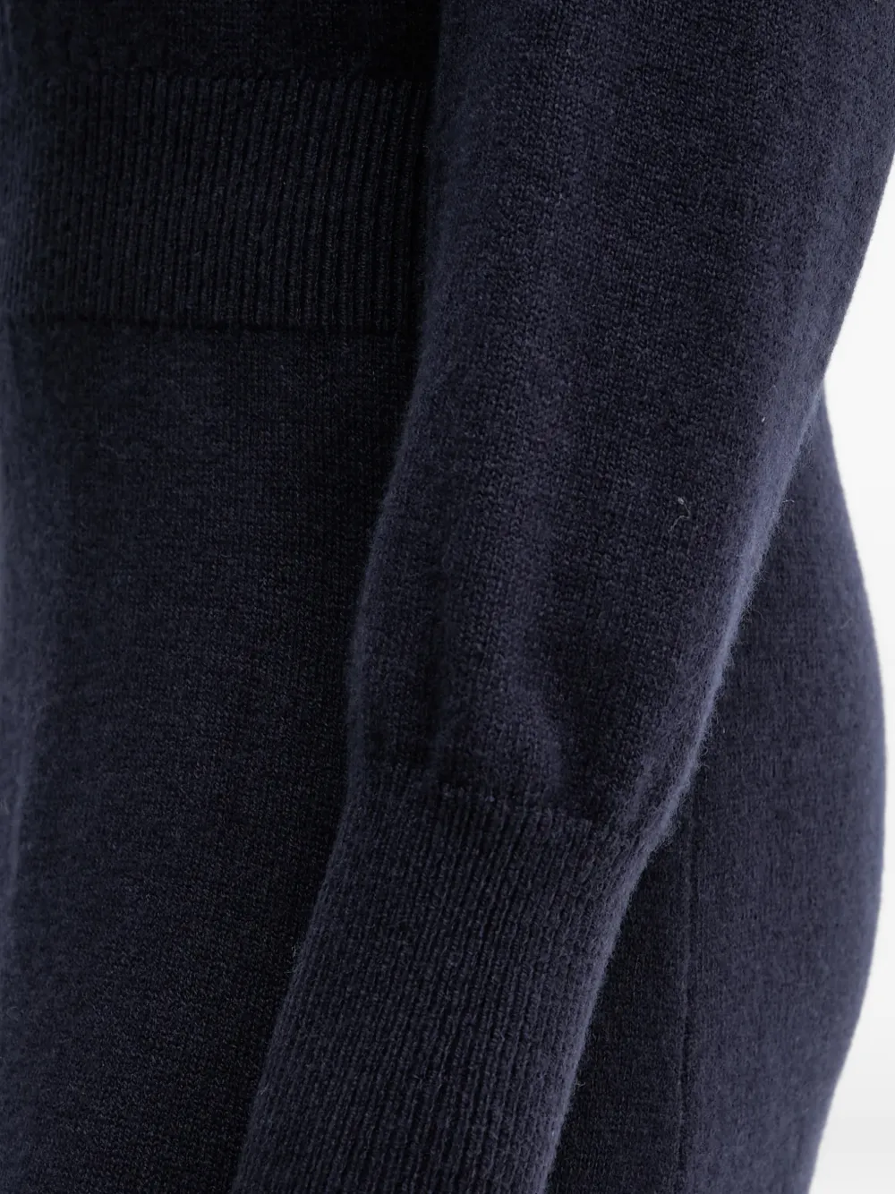 Темно-синий, ребристые детали, разрезы по бокам, круглый вырез, длинные рукава