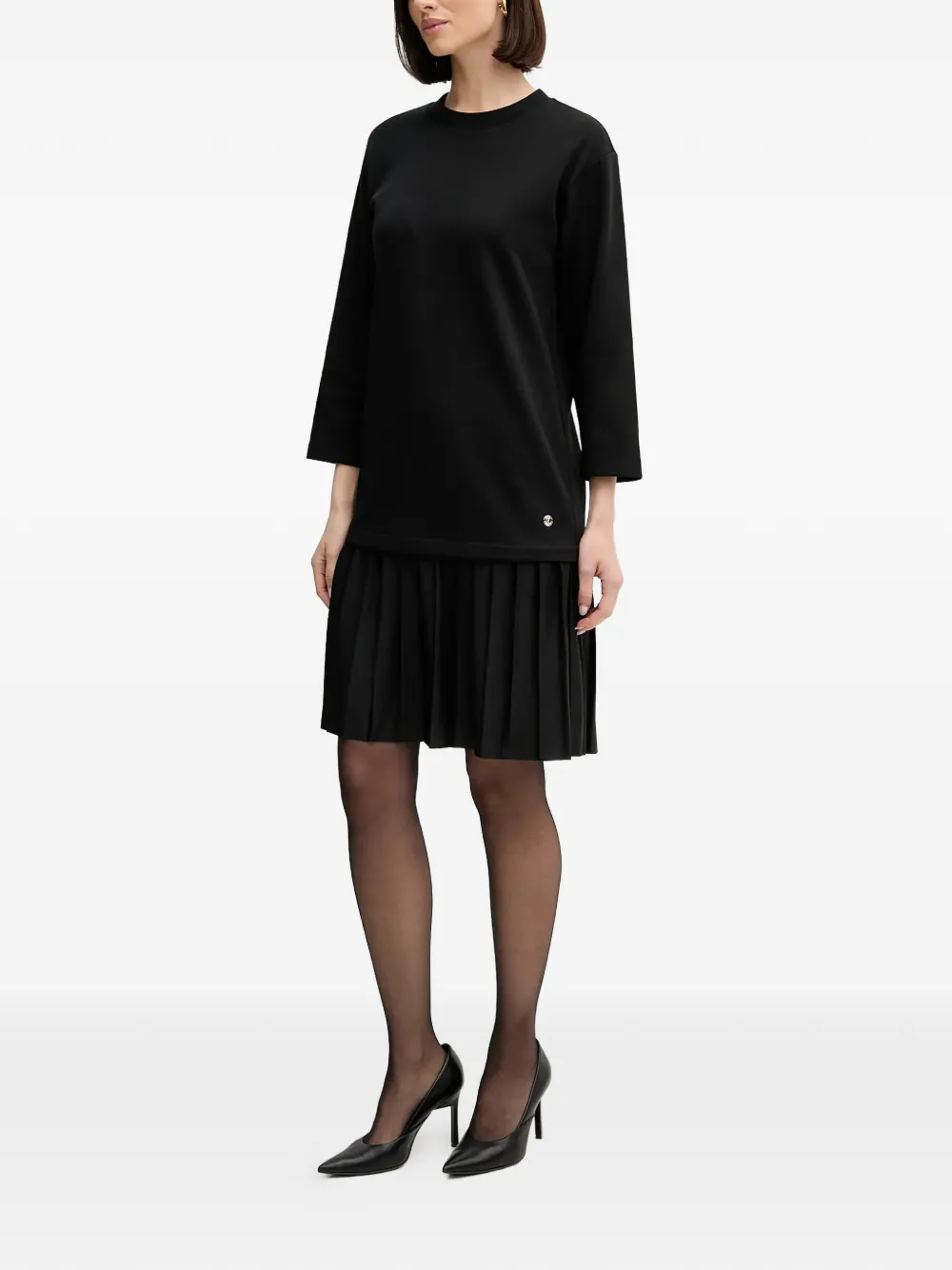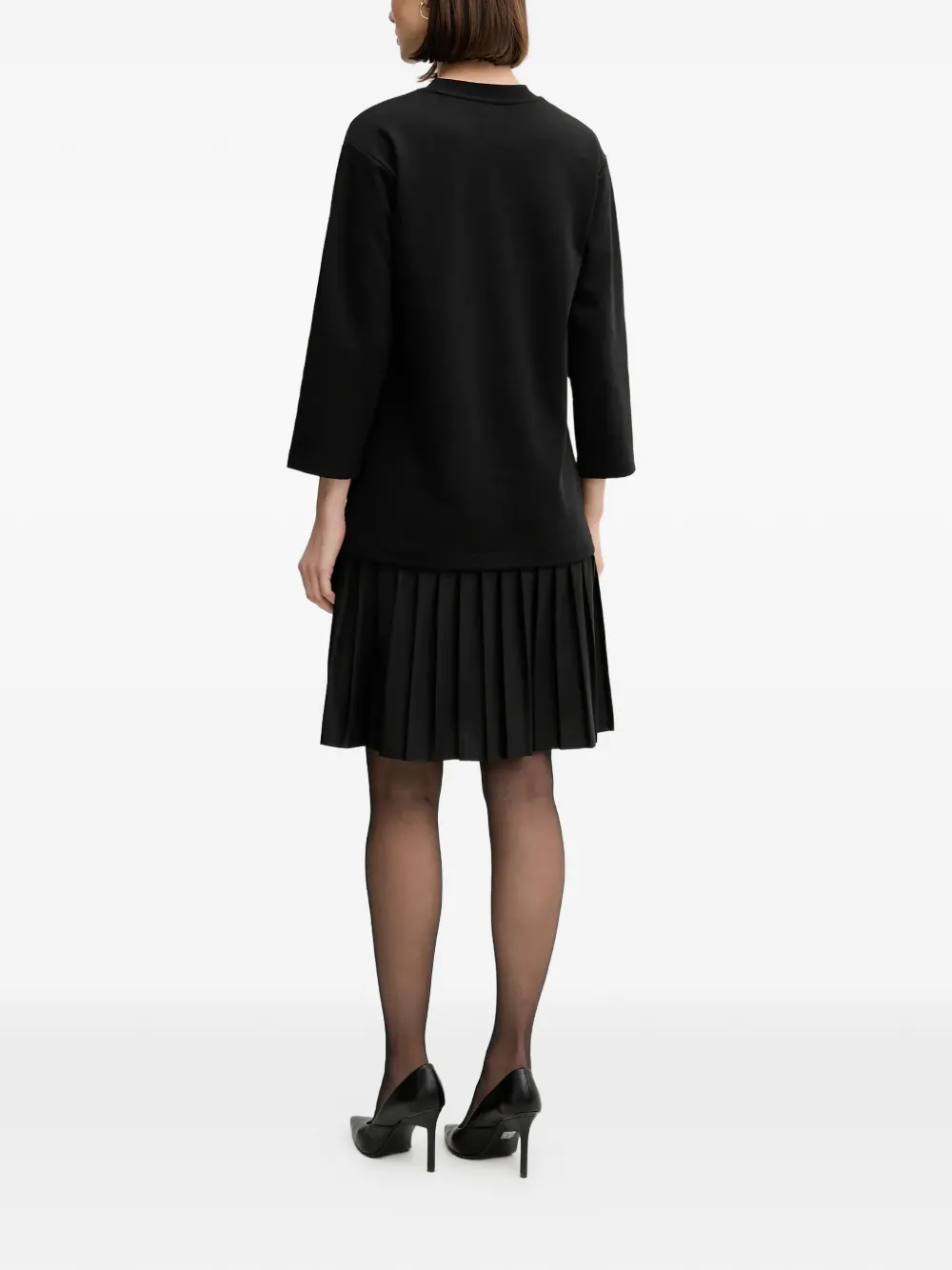 Черное платье с круглым вырезом, рукавами три четверти и плиссированной юбкой