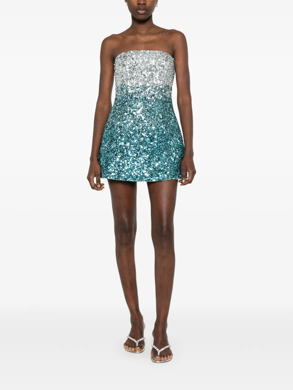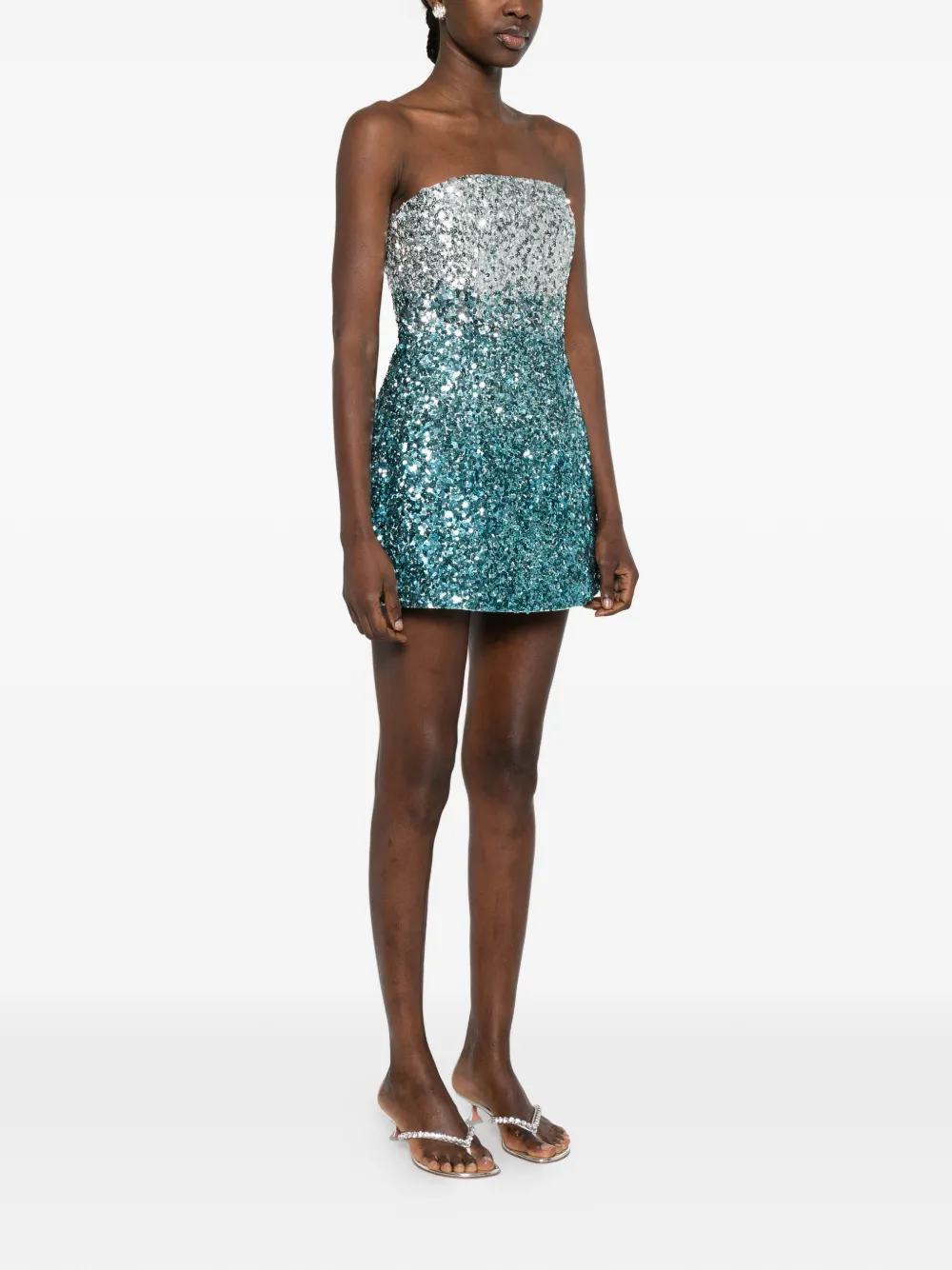 Синее мини-платье без бретелек с украшением из пайеток и градиентным эффектом