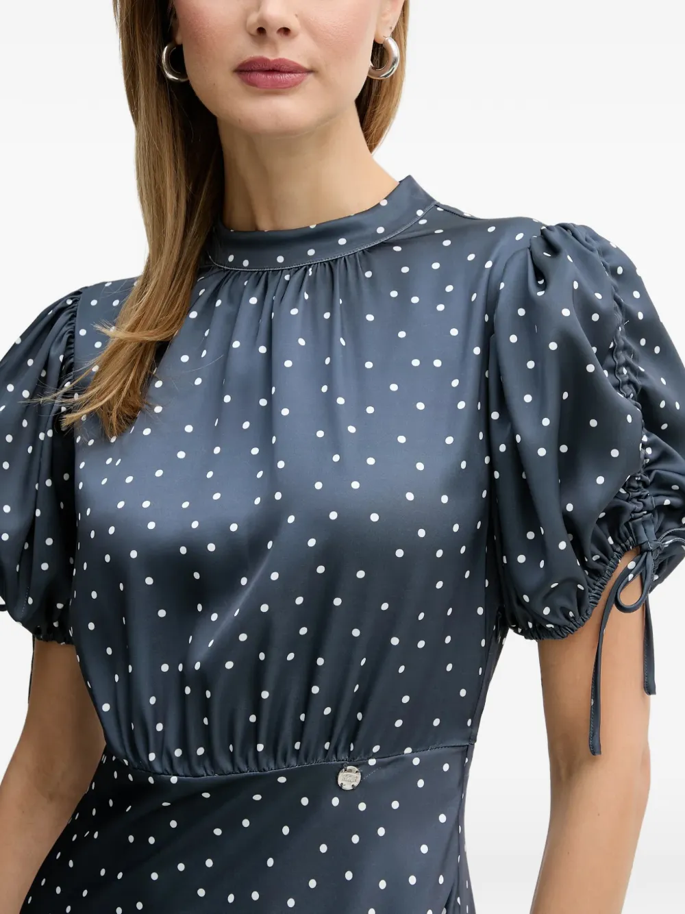 Темно-серый свитер в горошек с круглым вырезом, пышными рукавами и завязками