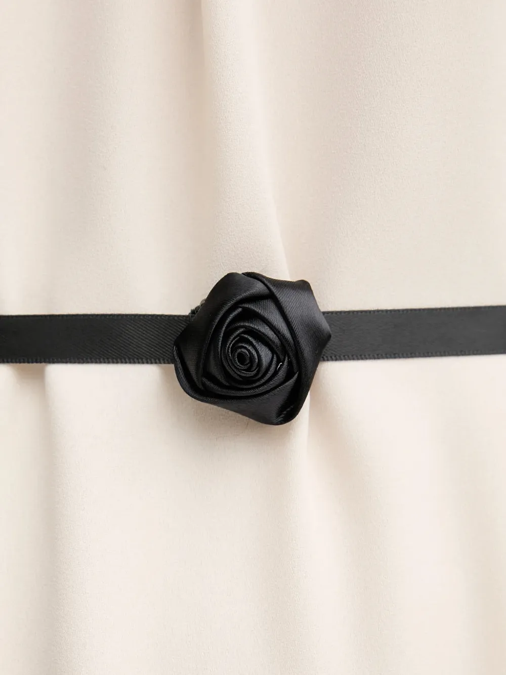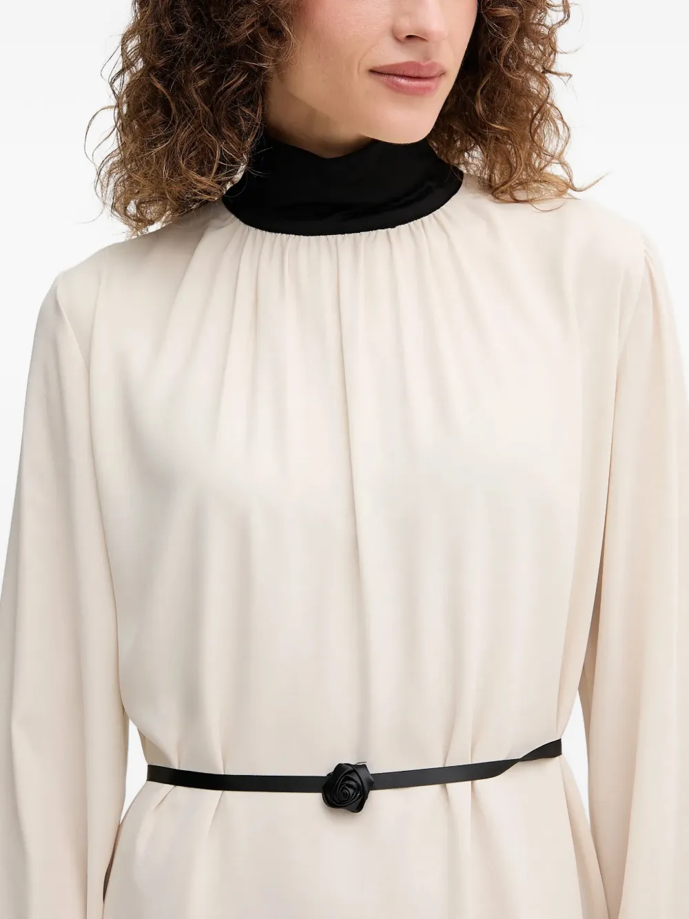 Бежевый, черный, с розой, длинные рукава, высокий ворот, пояс с завязками
