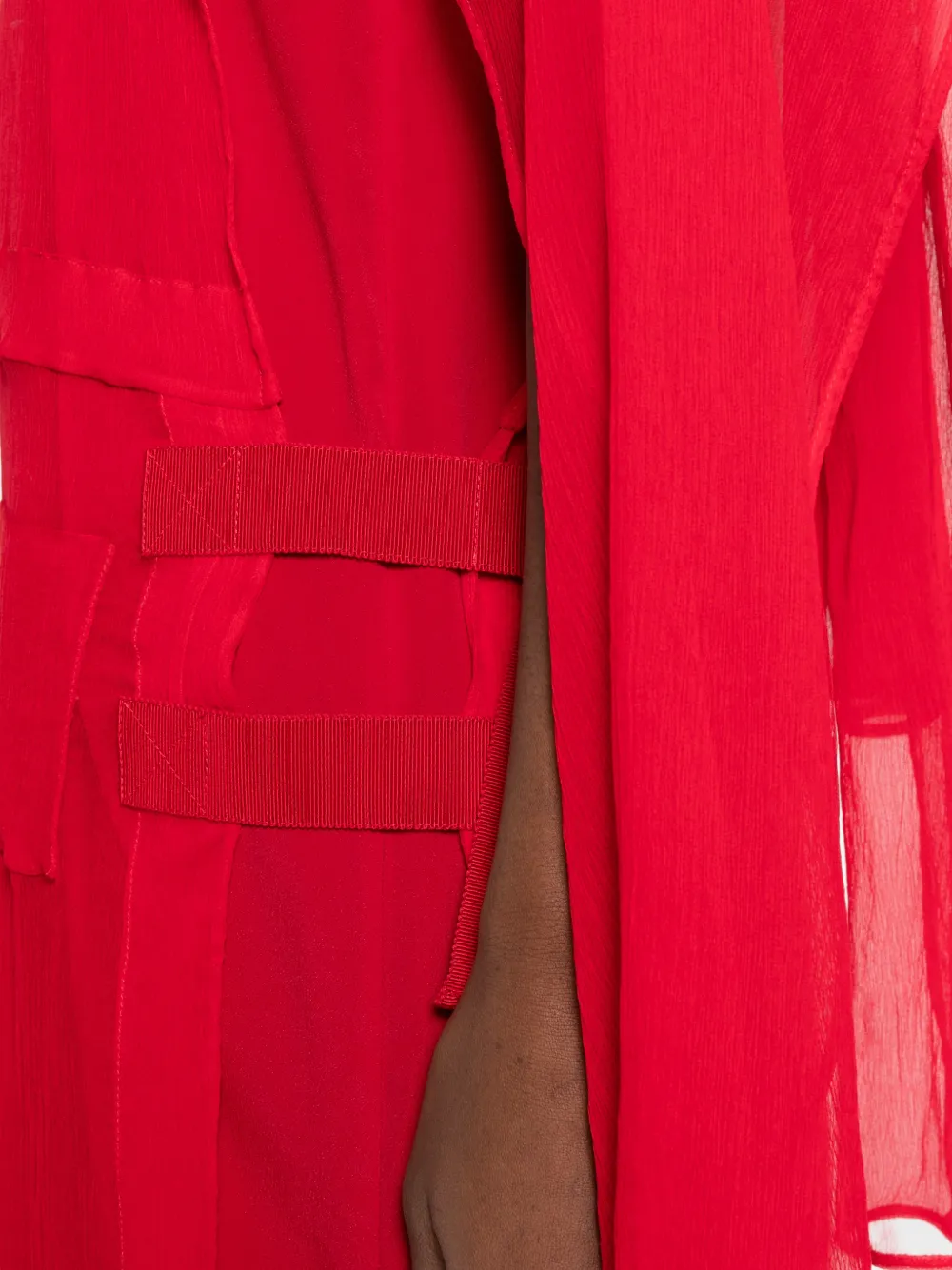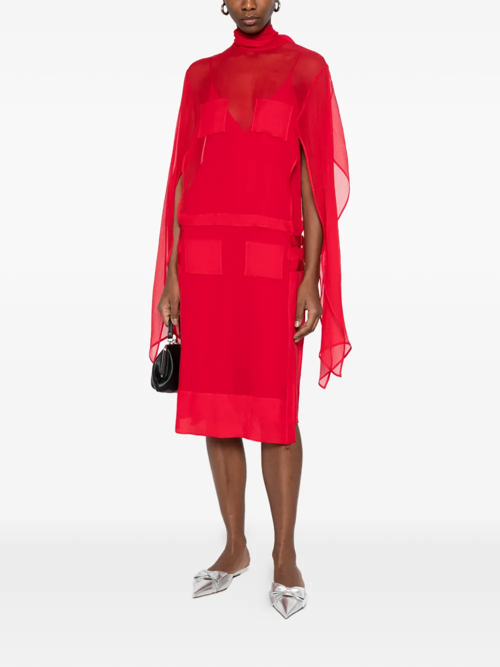 Красные карманы, завязка, полупрозрачная отделка, высокий ворот