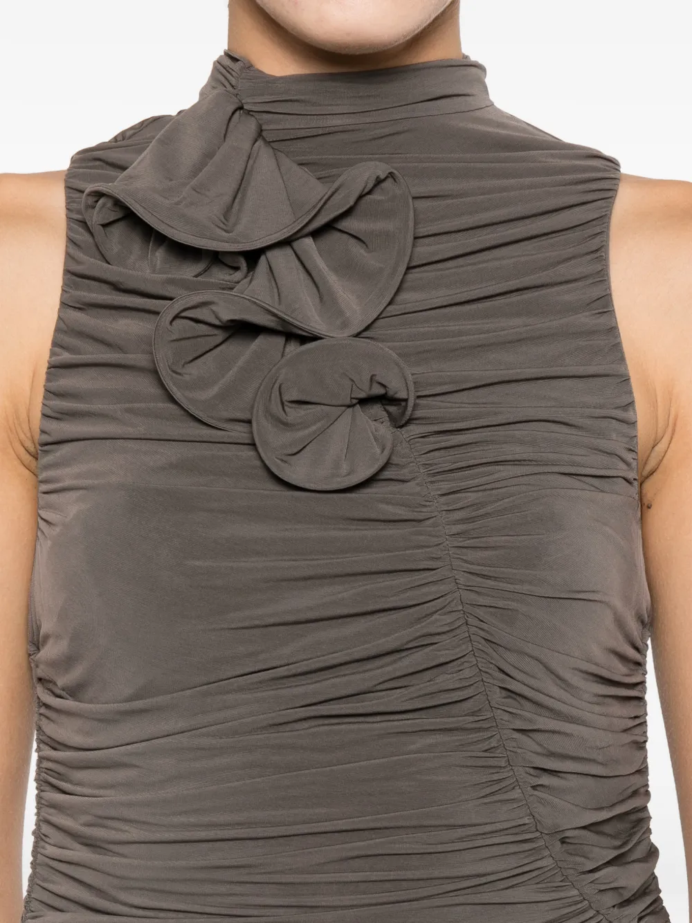 Коричневый топ с высоким воротом, цветочным декором и сборками