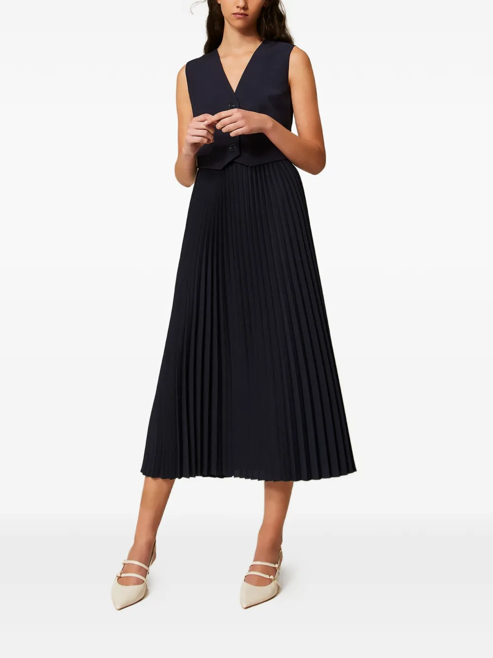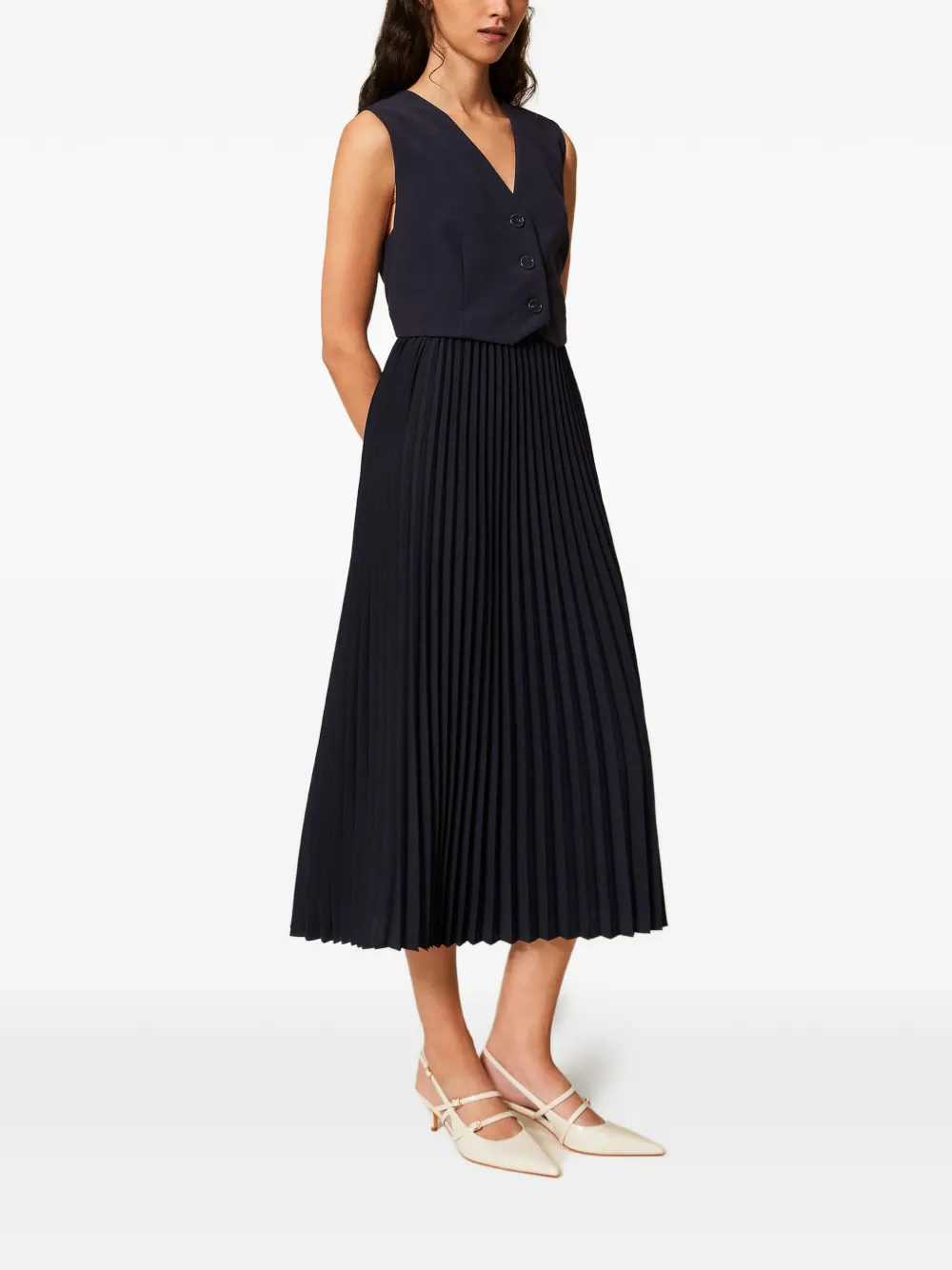 Темно-синяя плиссированная юбка, V-образный вырез, без рукавов