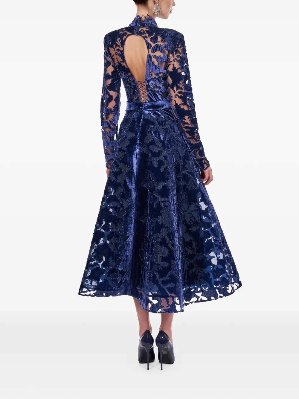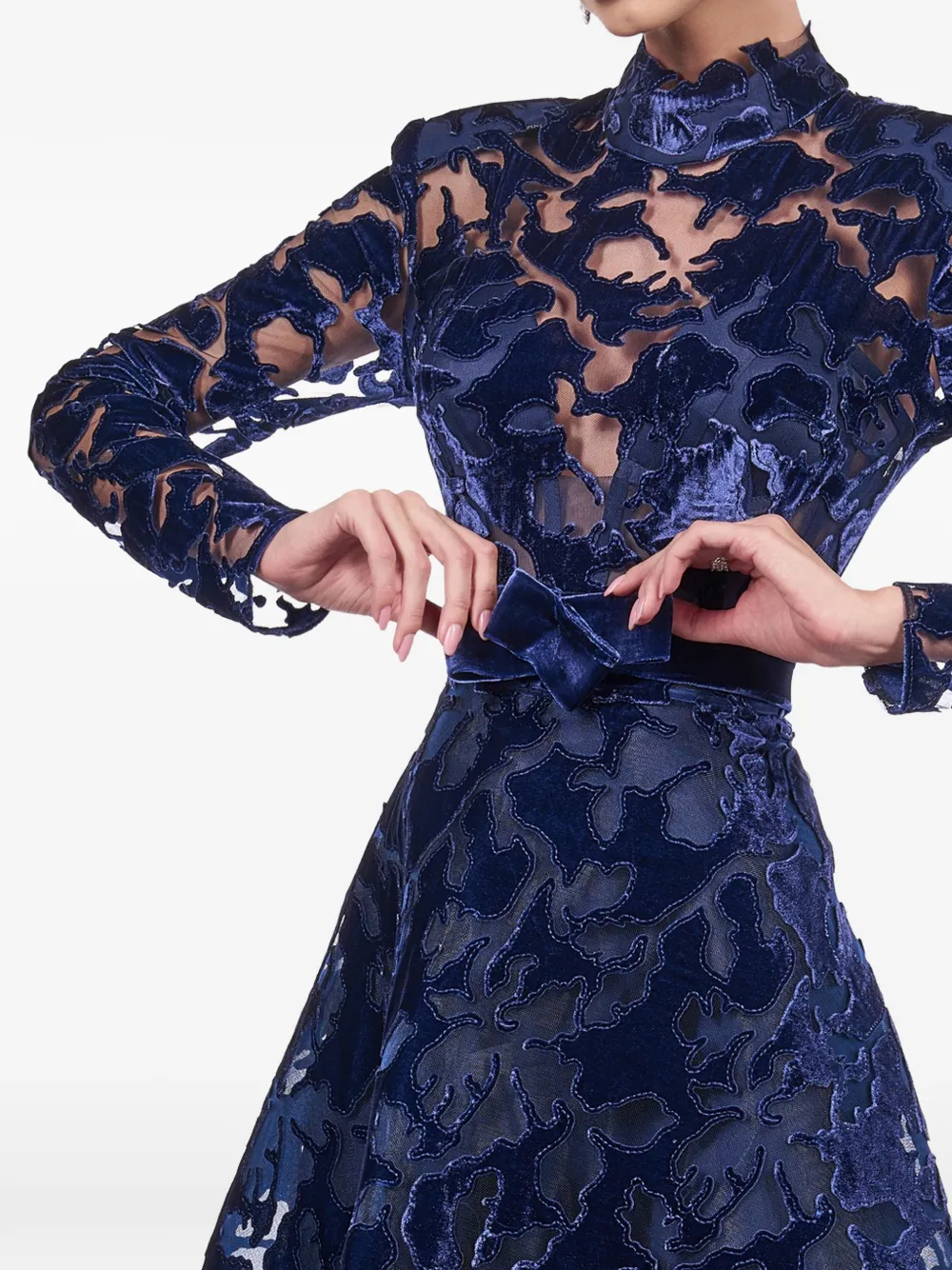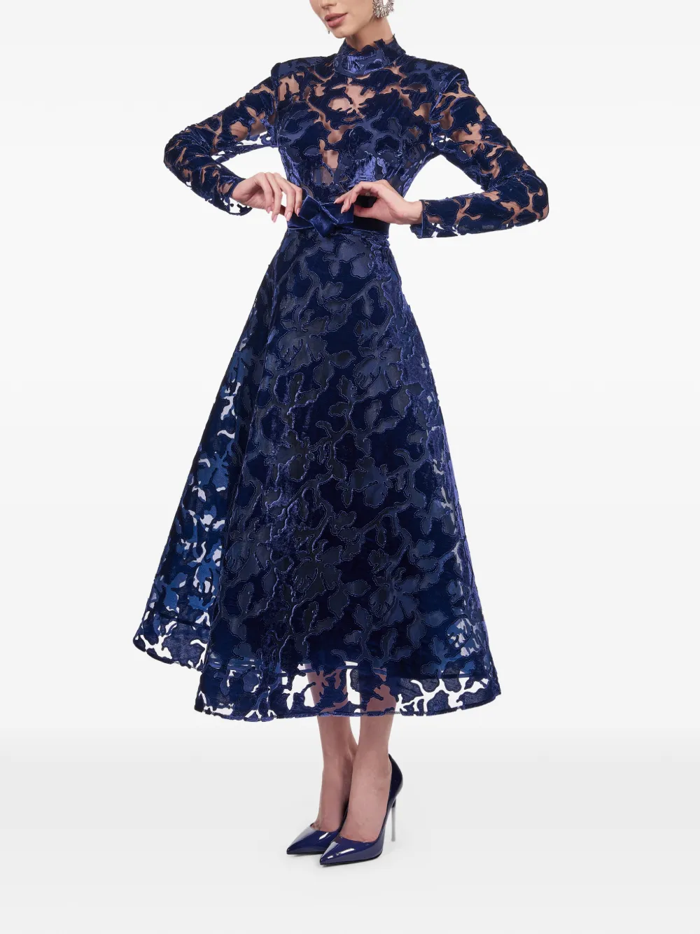 Синий с цветочным принтом, высокий ворот, длинные рукава