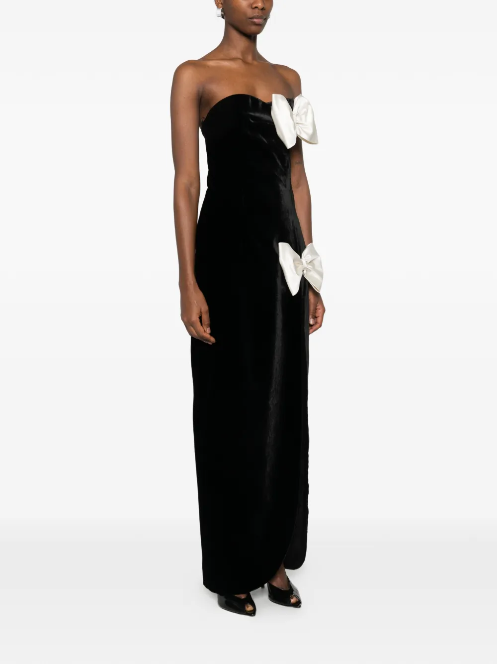 Черное платье без бретелек с бантами и разрезом спереди