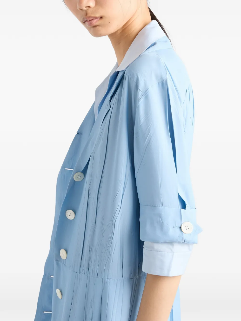 Изысканная легкость этого платья-рубашки подчеркивает настоящую, вне времени элегантность. Нежные слои придают объем женственному силуэту, который формируется плиссированной юбкой и двойным воротником в стиле ретро.