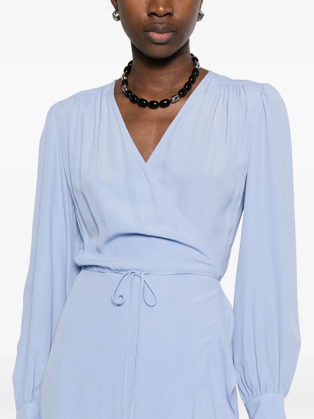 Голубое платье с запахом, оборками по краю, длинными рукавами, завязывающееся на поясе, V-образный вырез
