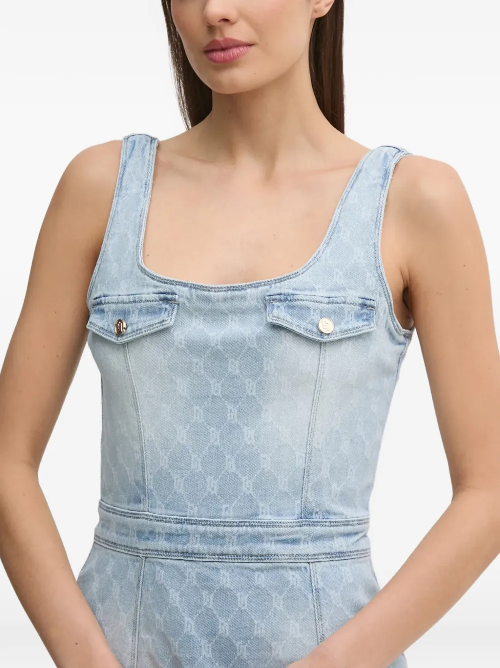 Светло-голубой, с узором по всей поверхности, застежка-молния, без рукавов, квадратный вырез