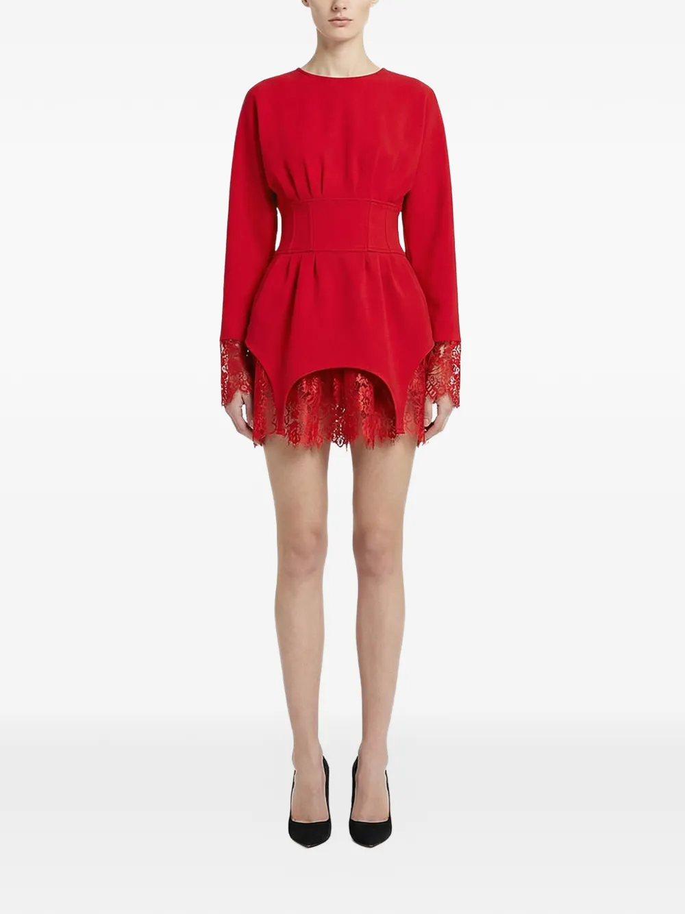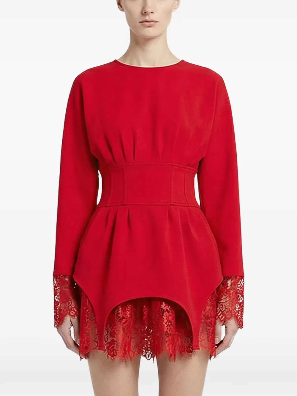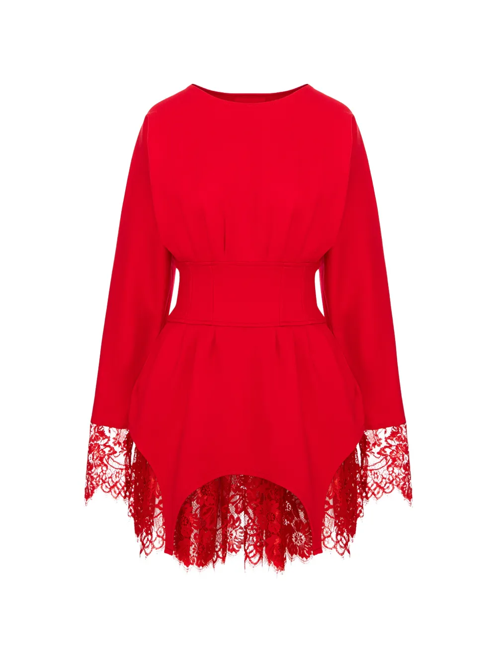 Красный корсет с кружевной отделкой, длинными рукавами, приталенным силуэтом и асимметричным подолом