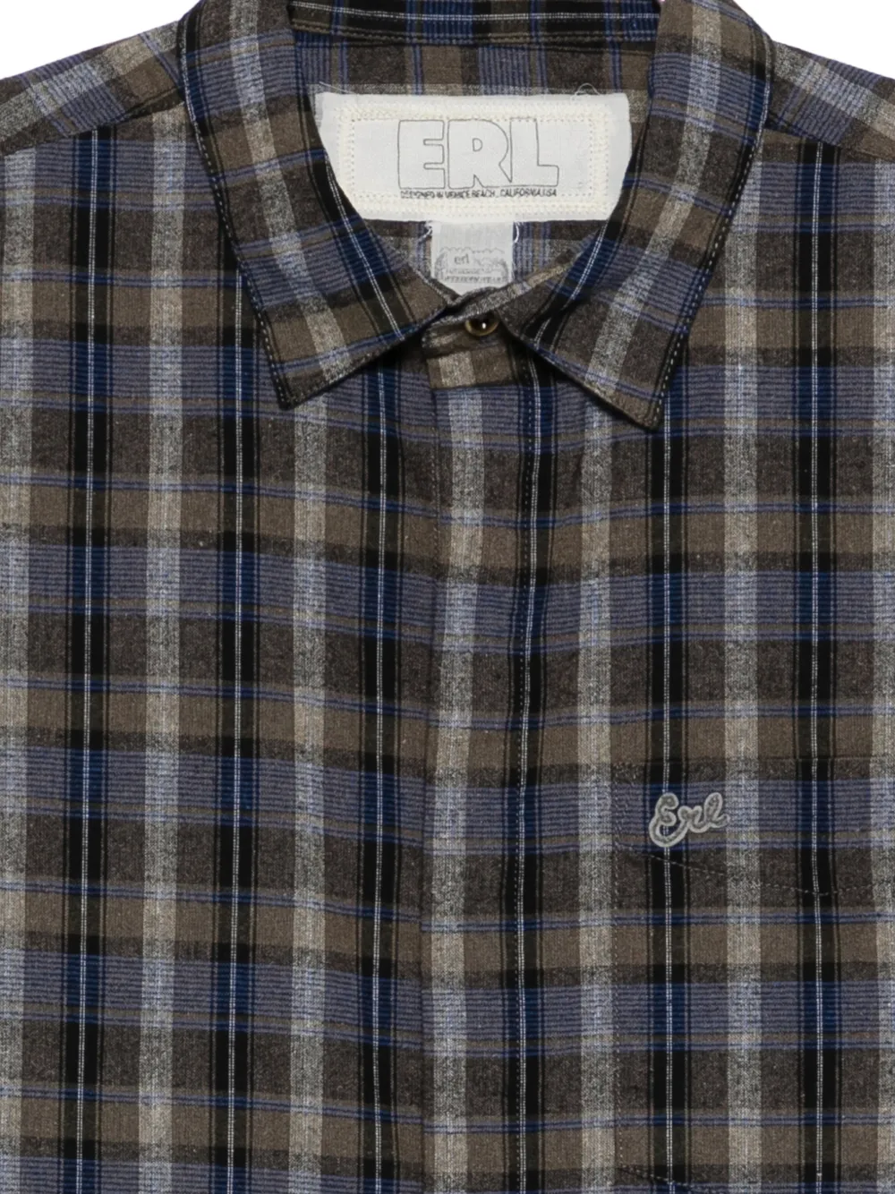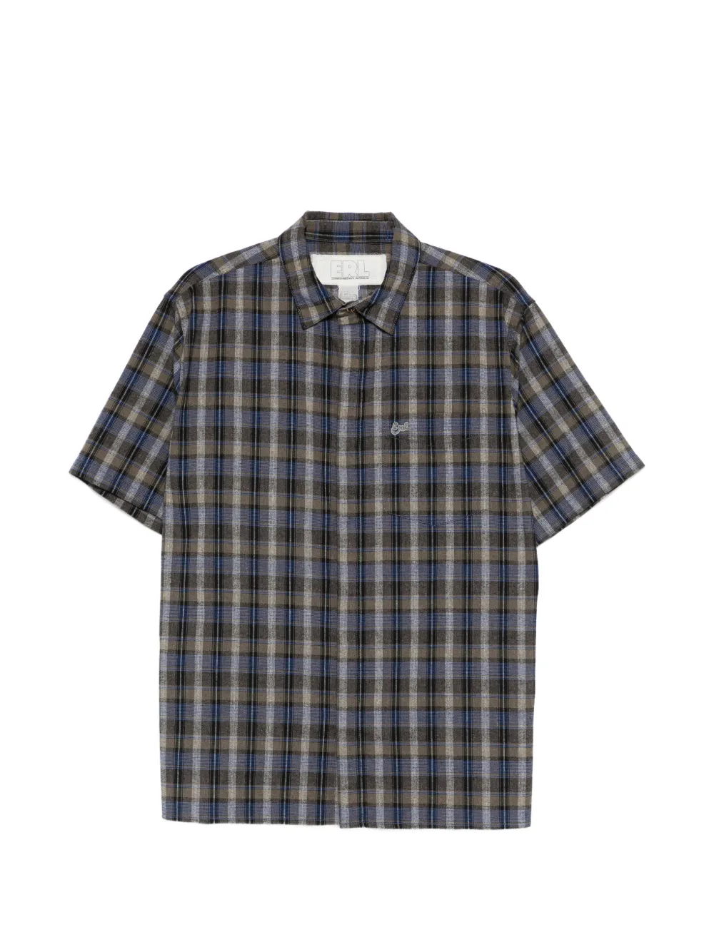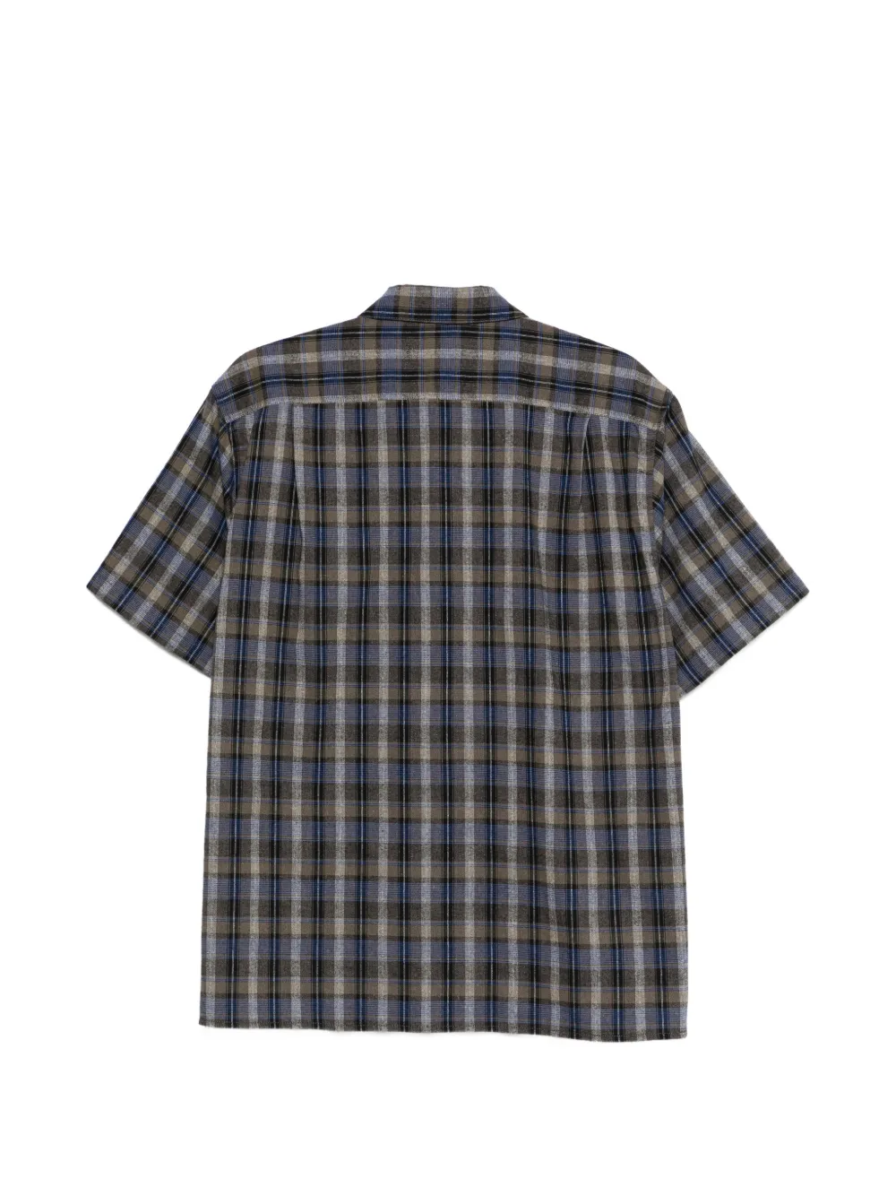Коричневая рубашка в клетку с короткими рукавами, нашивкой с логотипом и застежкой на пуговицы