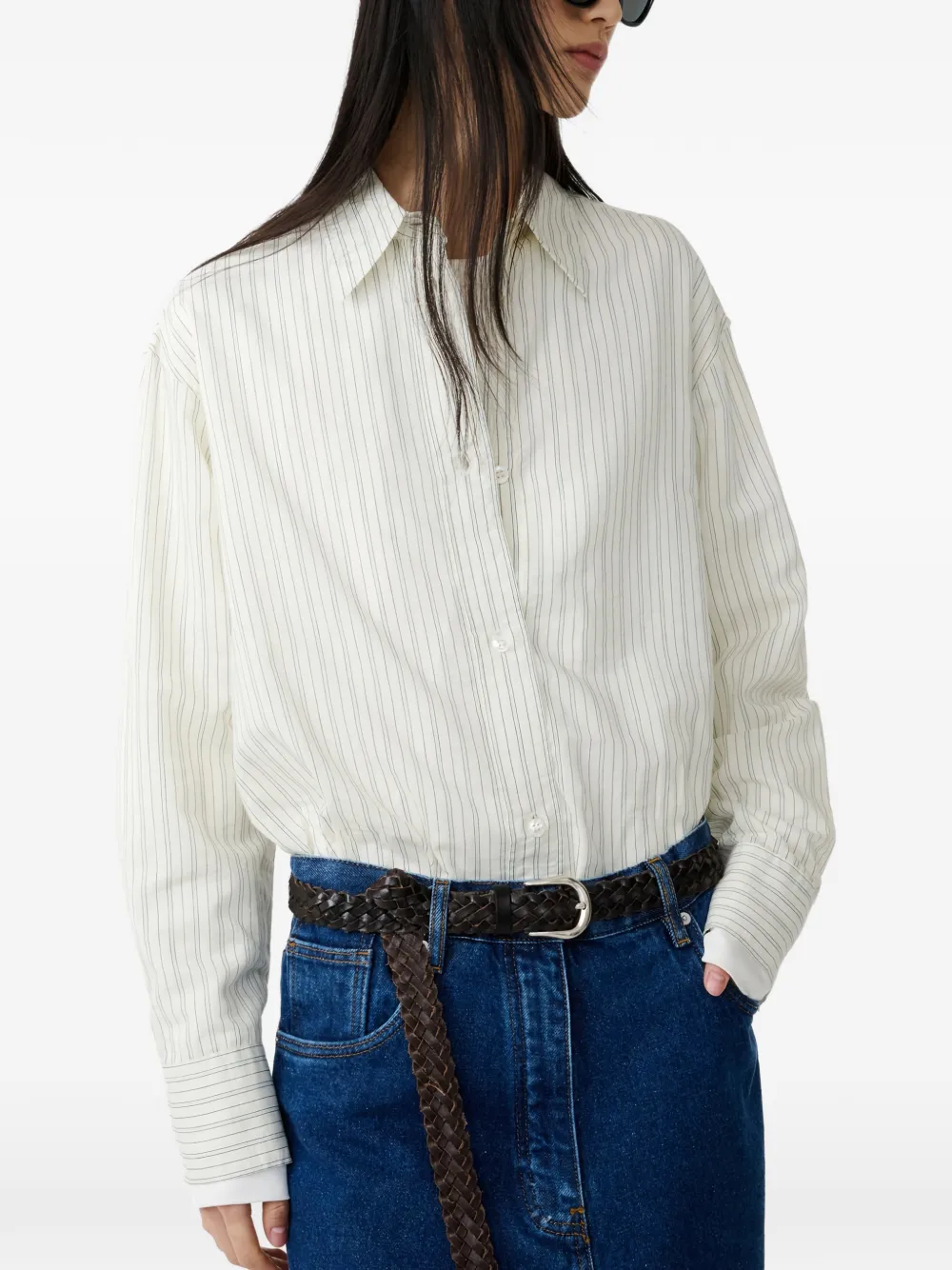 Белая и серая рубашка в полоску, воротник с острыми концами, застежки на манжетах, закругленный подол, складка бокс сзади