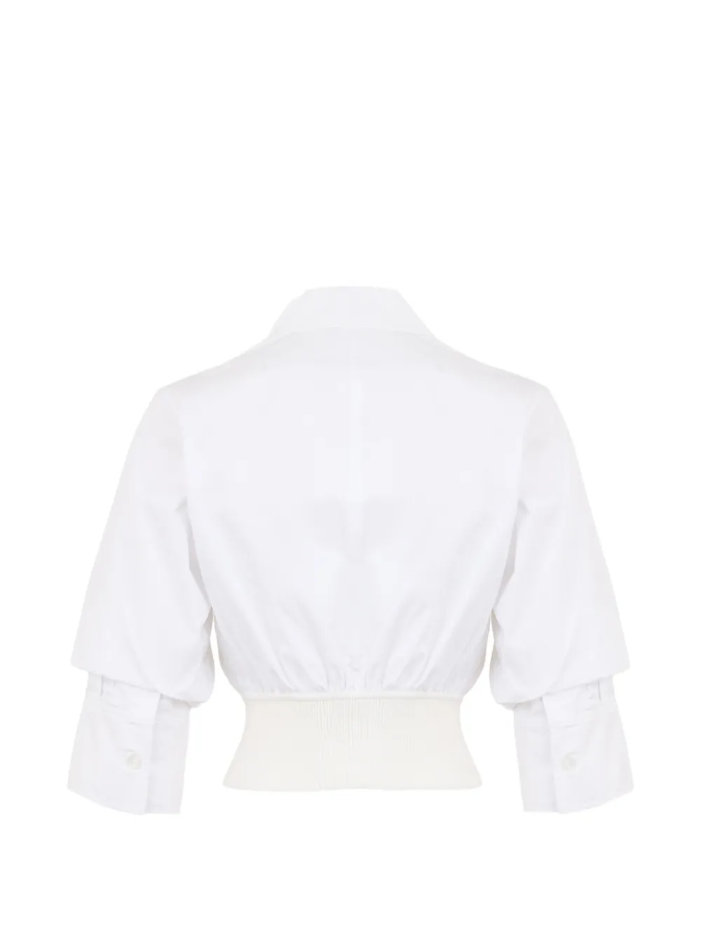 Белый воротник с острыми углами, застежка на пуговицы, рукава три четверти, манжеты на пуговицах