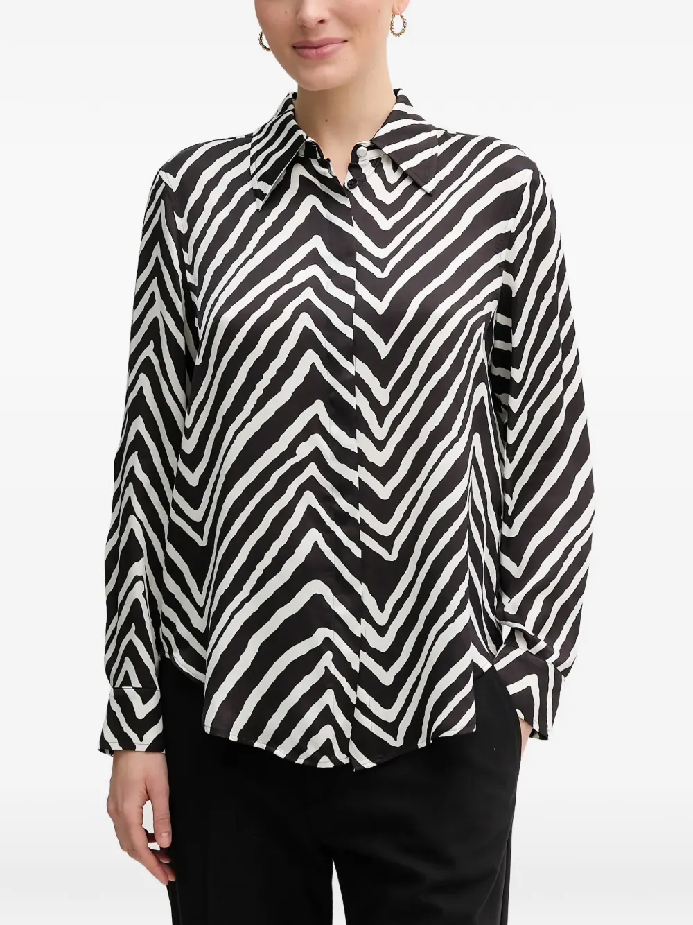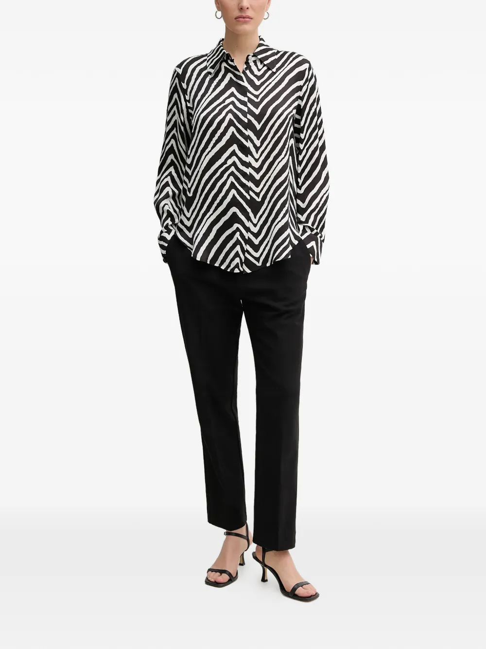 Белая и черная рубашка с принтом зебры, застежкой на пуговицы, длинными рукавами и классическим воротником