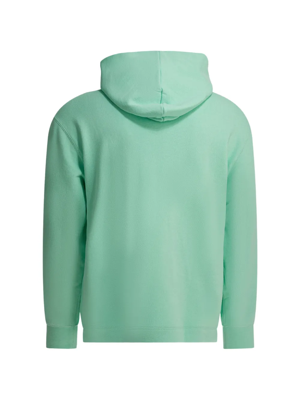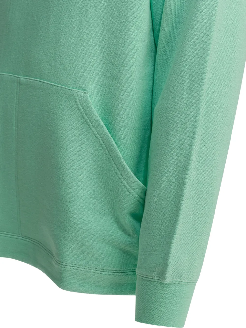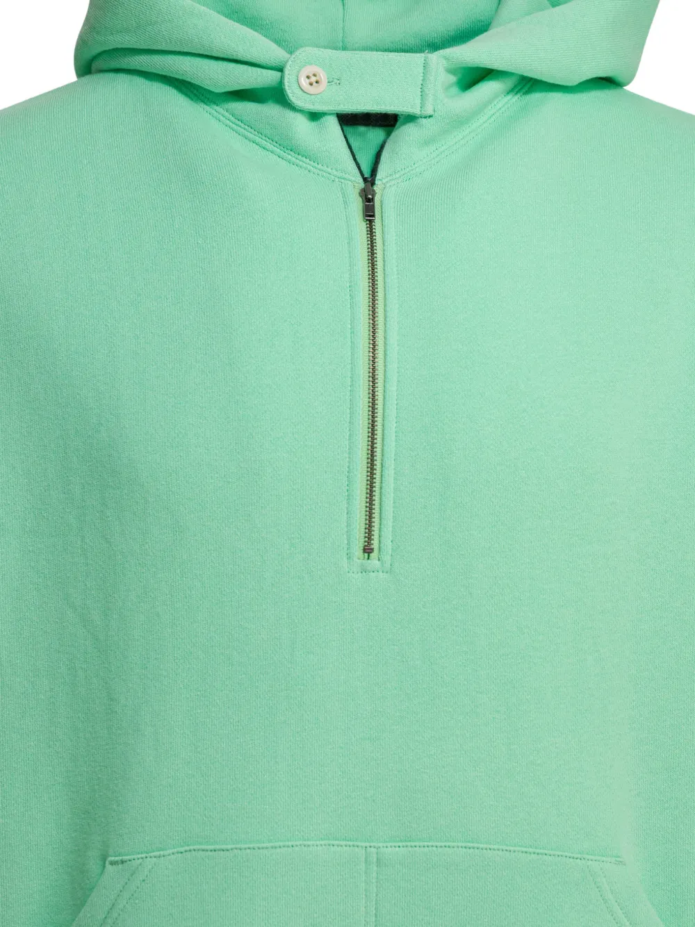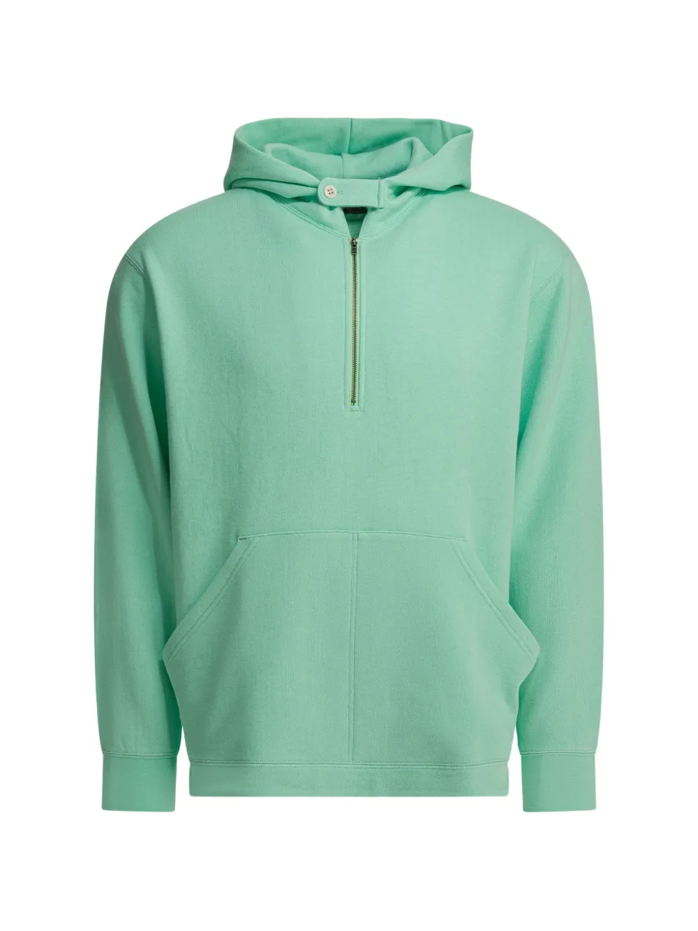 Зеленый цвет, застежка наполовину на молнии, пуговичная планка на капюшоне, передний карман-кенгуру, длинные рукава, ребристый край