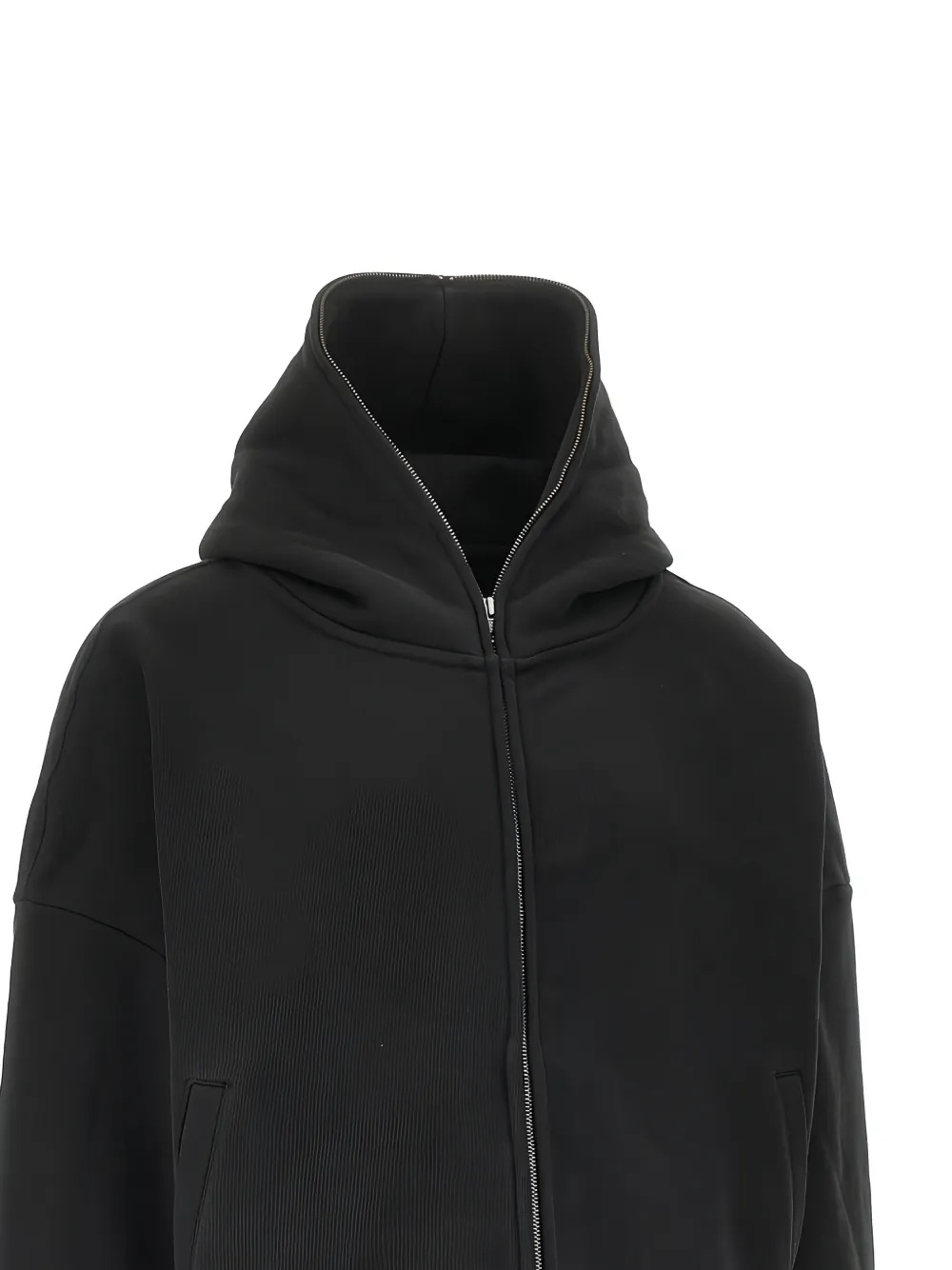 Черный худи на молнии, передние карманы, ребристые манжеты и низ