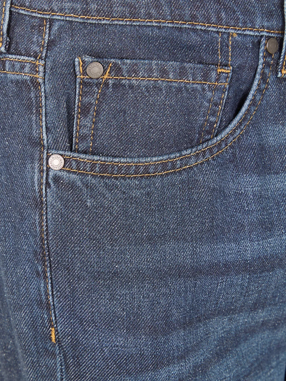 Синие прямые брюки с пятью карманами и шлевками для ремня