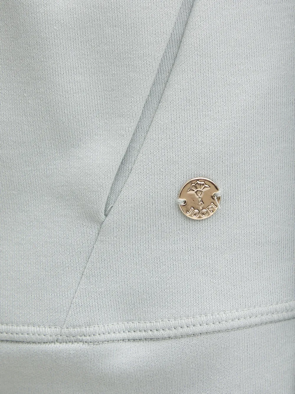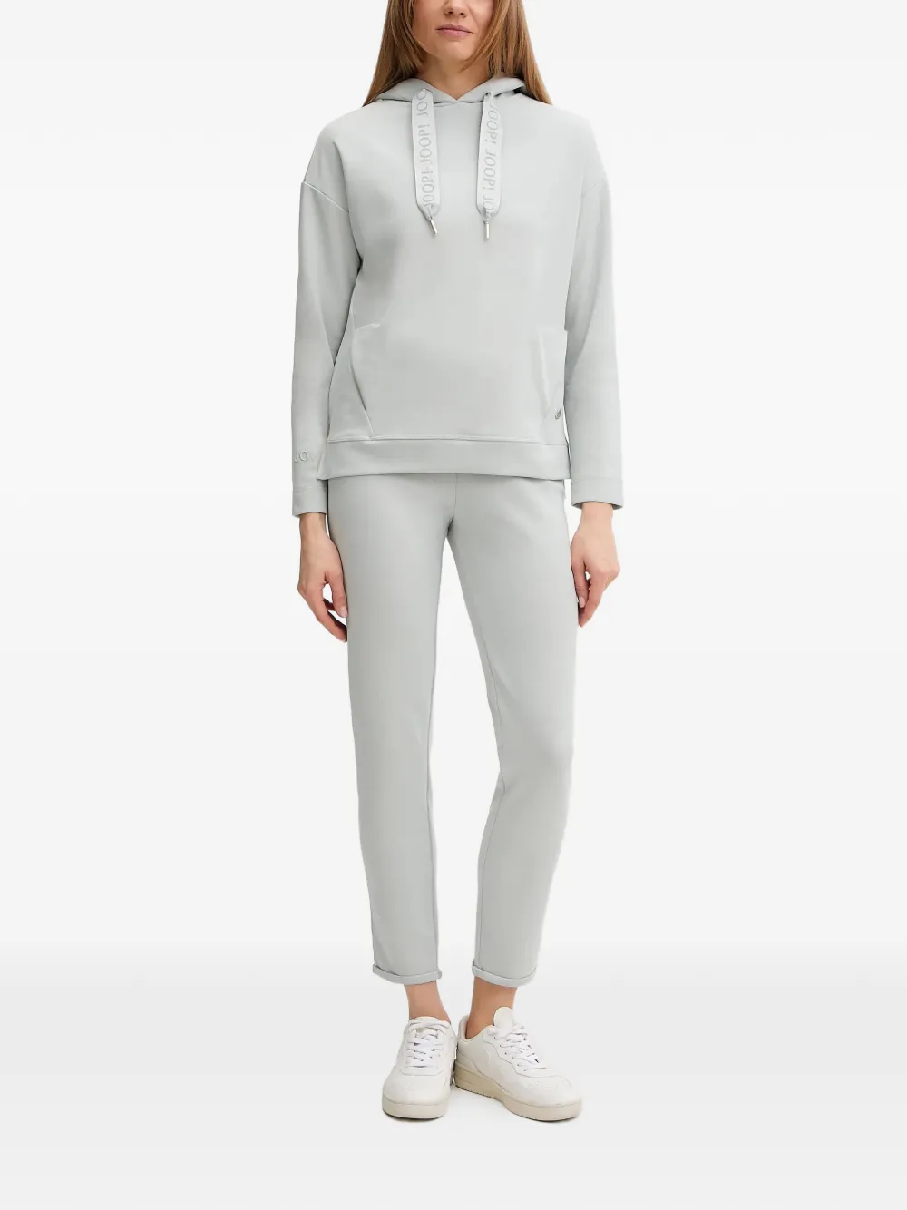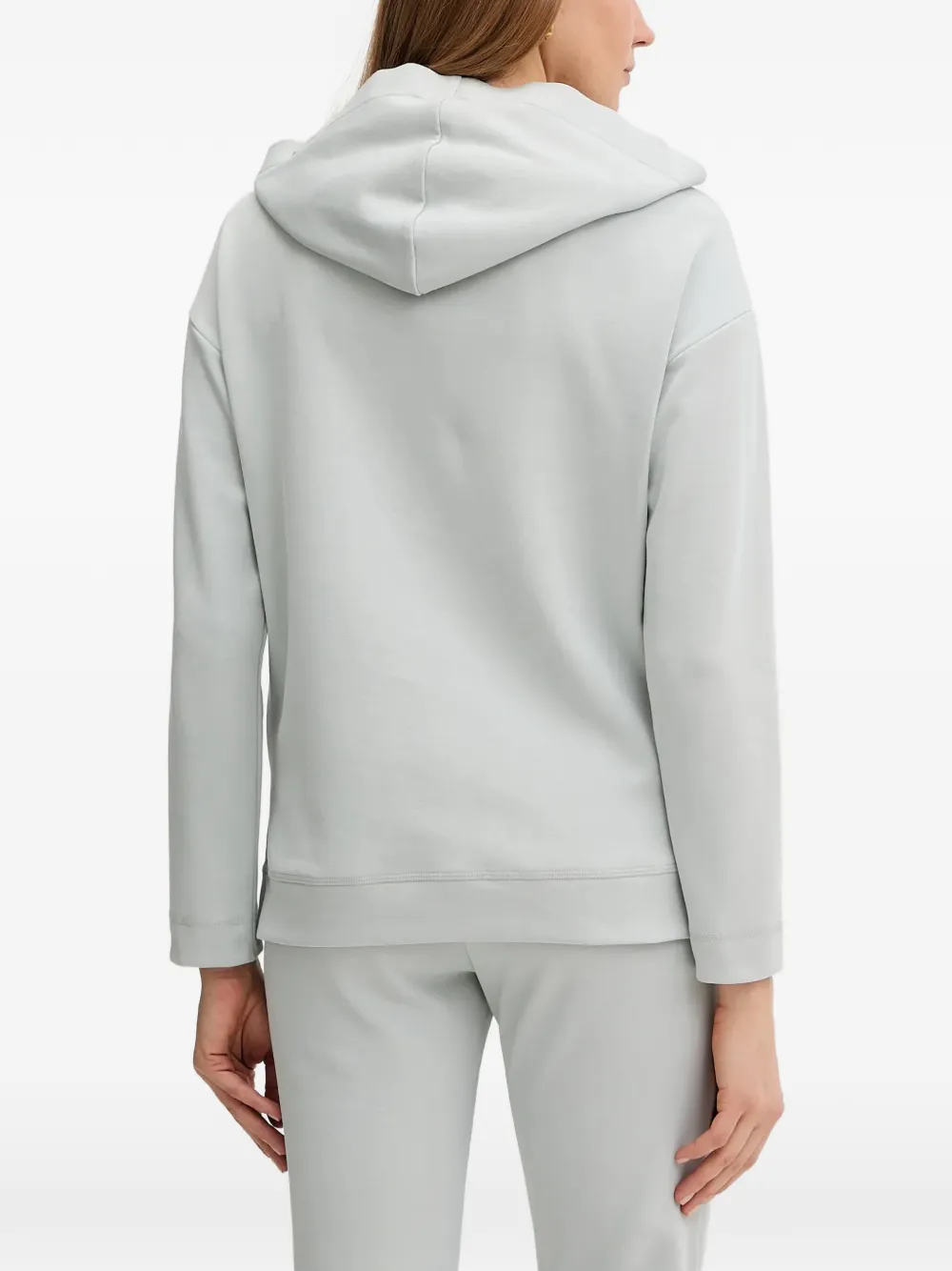 Светло-серый худи на кулиске, длинные рукава, металлические детали, однотонная отделочная строчка, боковые прорезные карманы