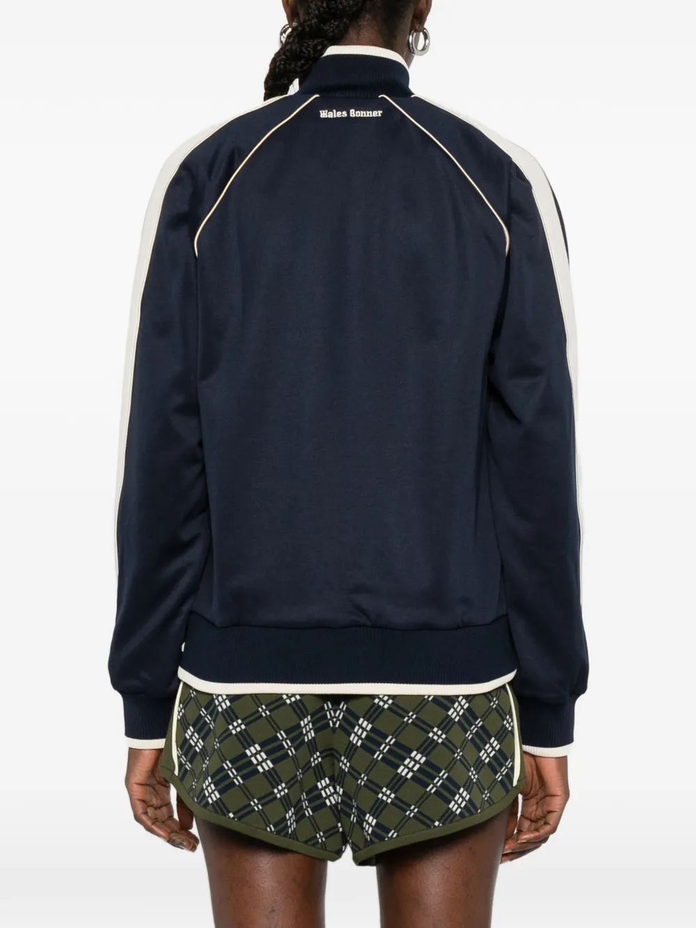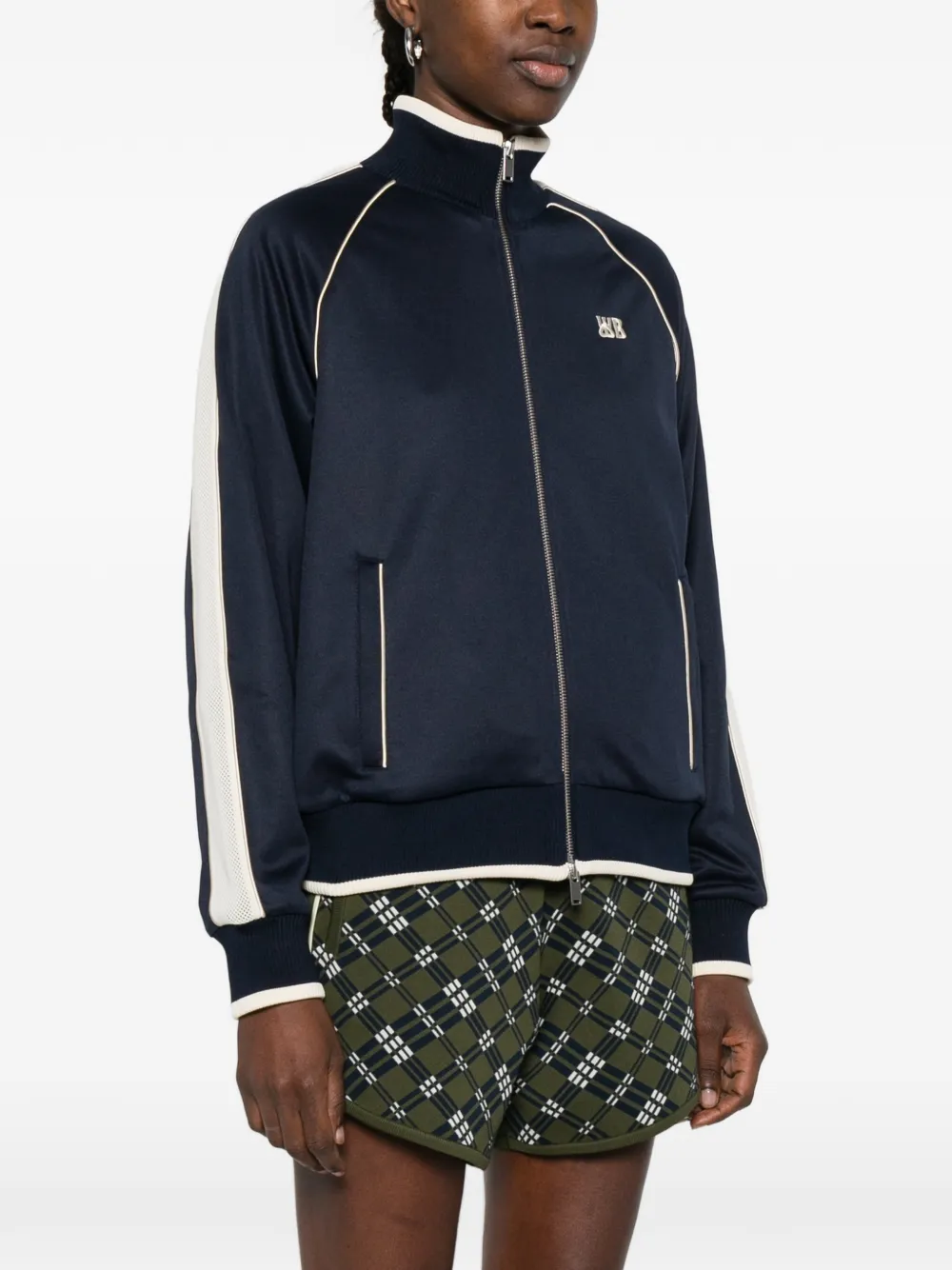 Темно-синий цвет, логотип, застежка-молния спереди, прорезные карманы, трикотажная отделка, полосатый декор