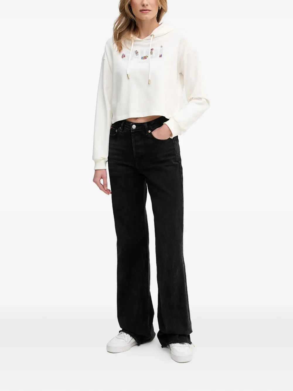 Белый капюшон с кулиской, длинные рукава, ребристый низ, ребристые манжеты
