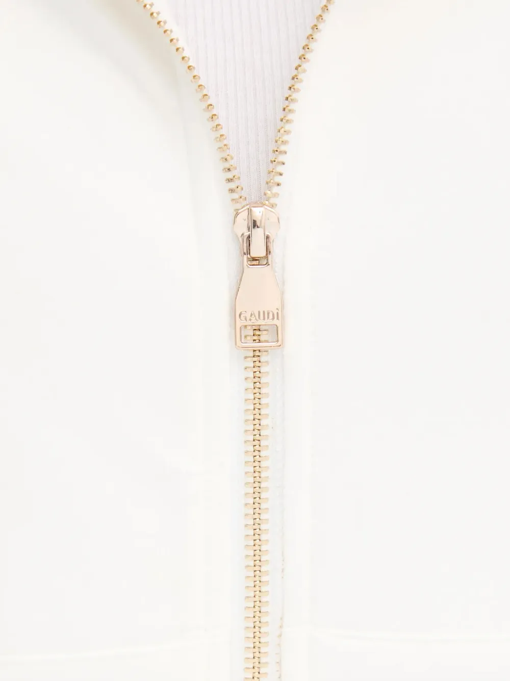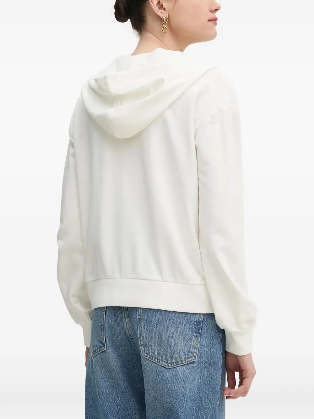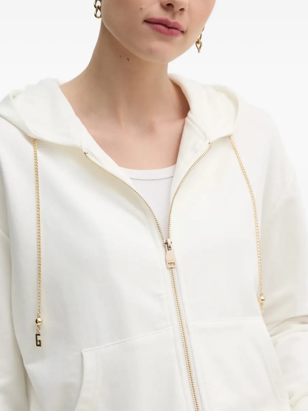 Белый капюшон, застежка-молния, кулиска, передние карманы, длинные рукава