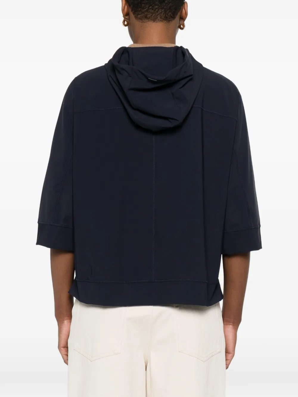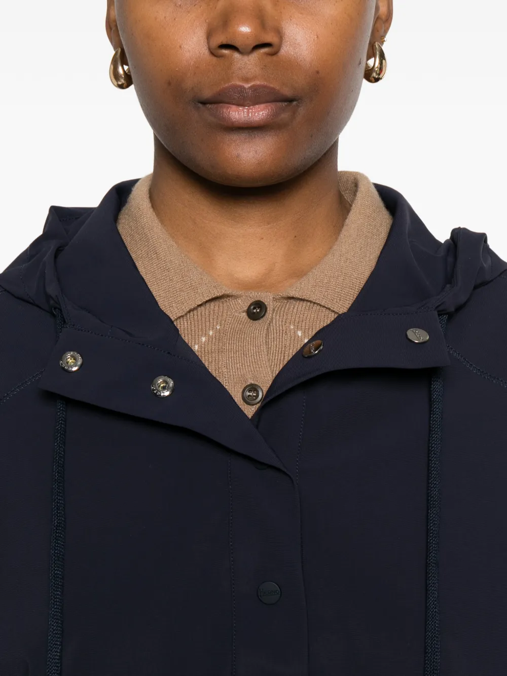 Темно-синий капюшон, застежка на пуговицы спереди, затягивающийся шнурок