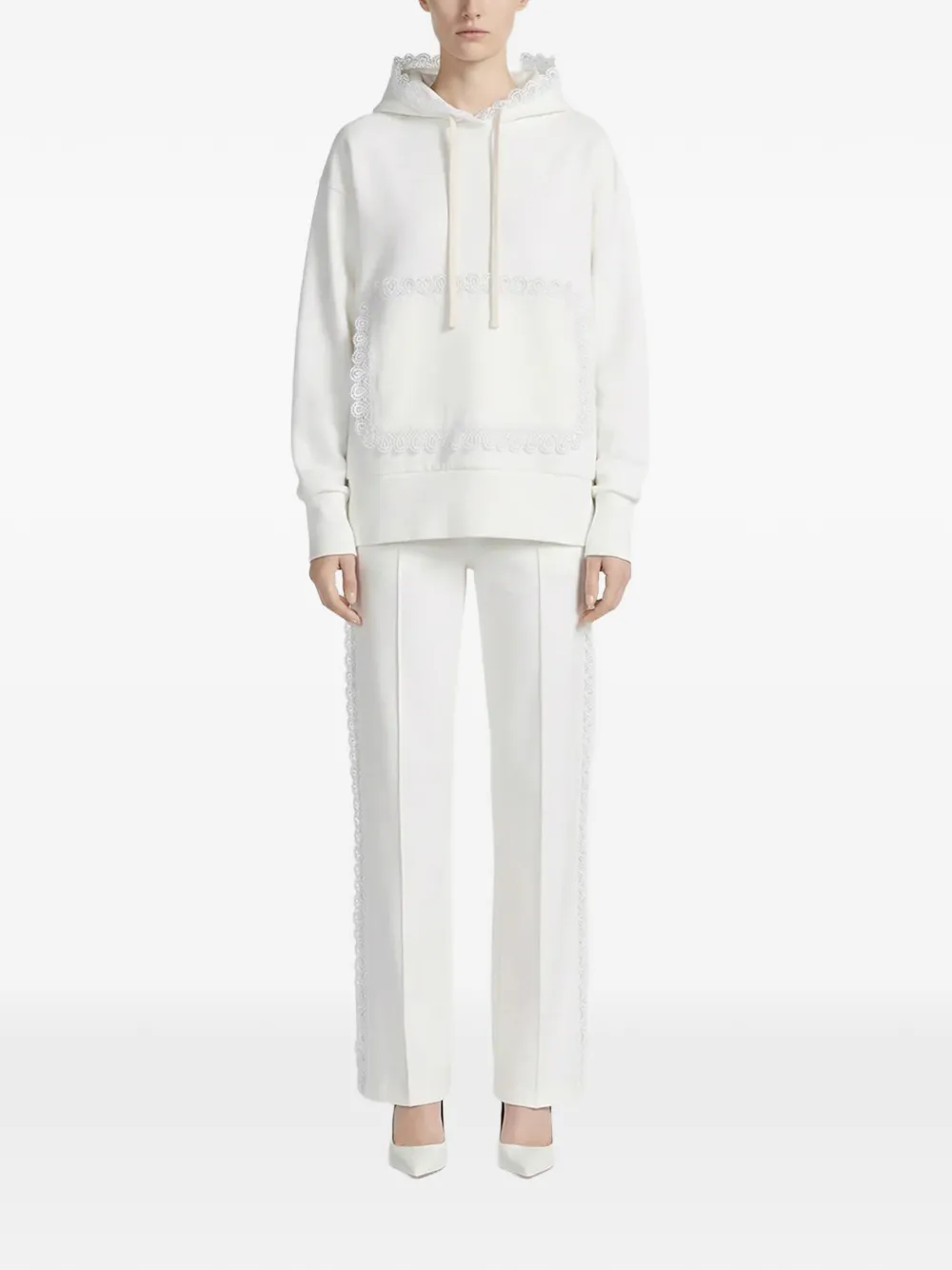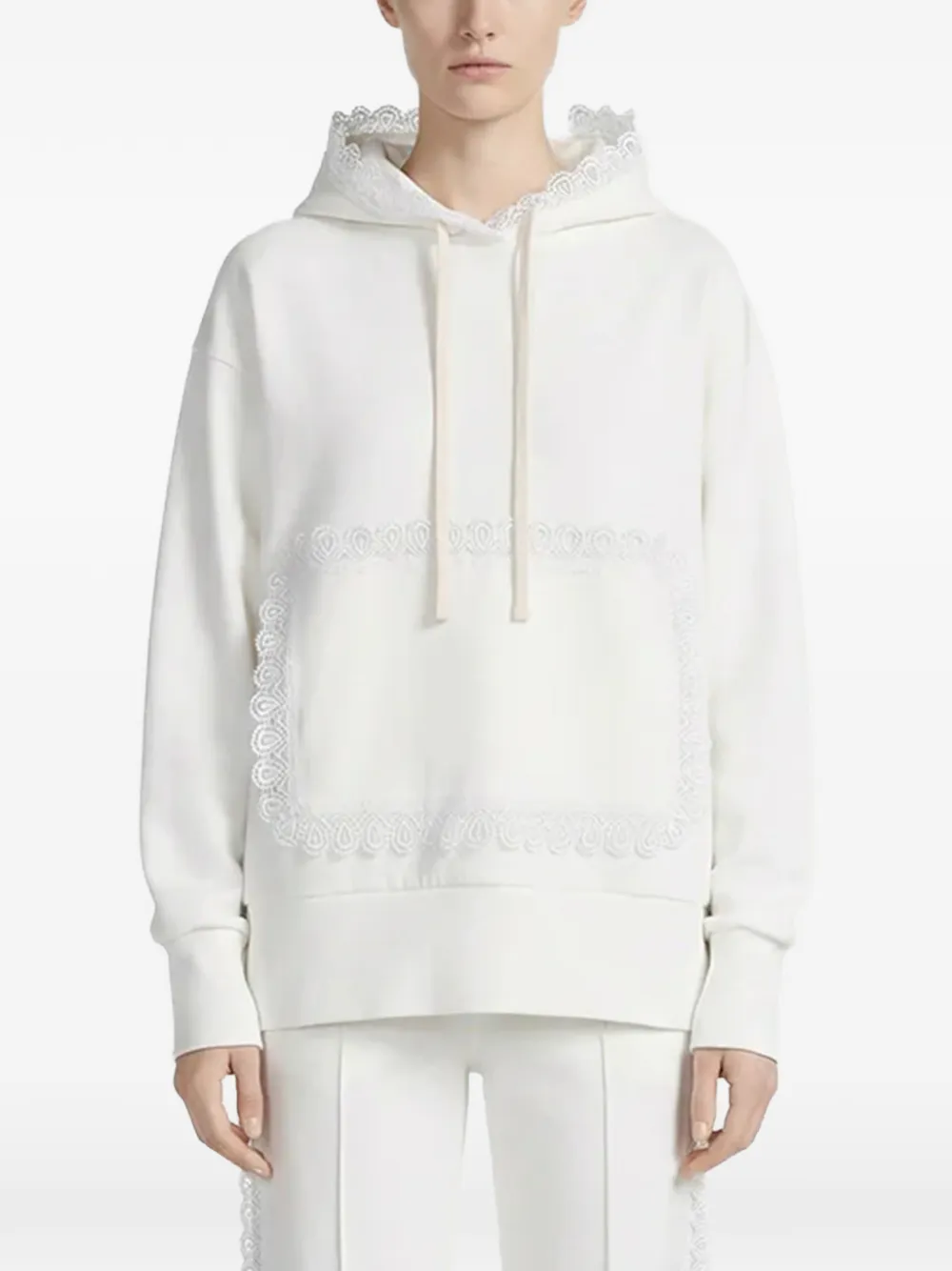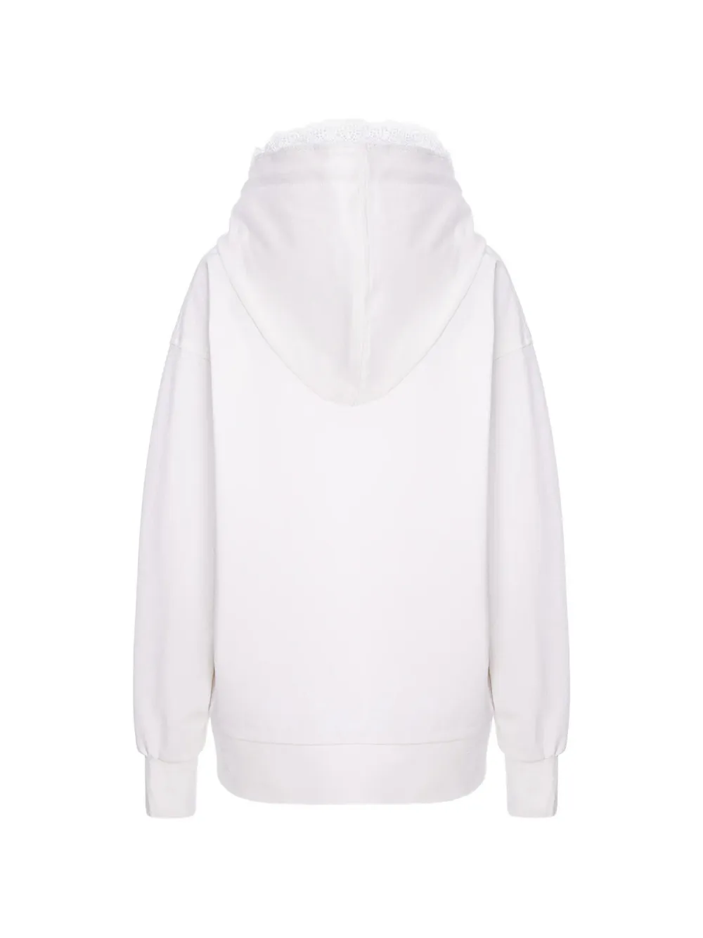 Белый с кружевной отделкой, капюшоном на завязках и карманом-кенгуру