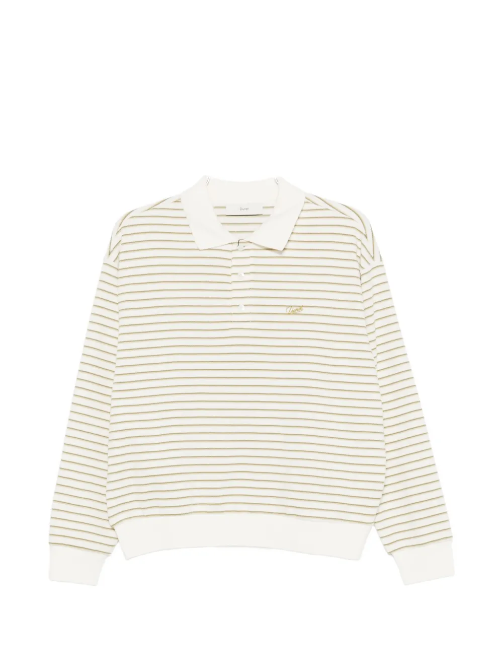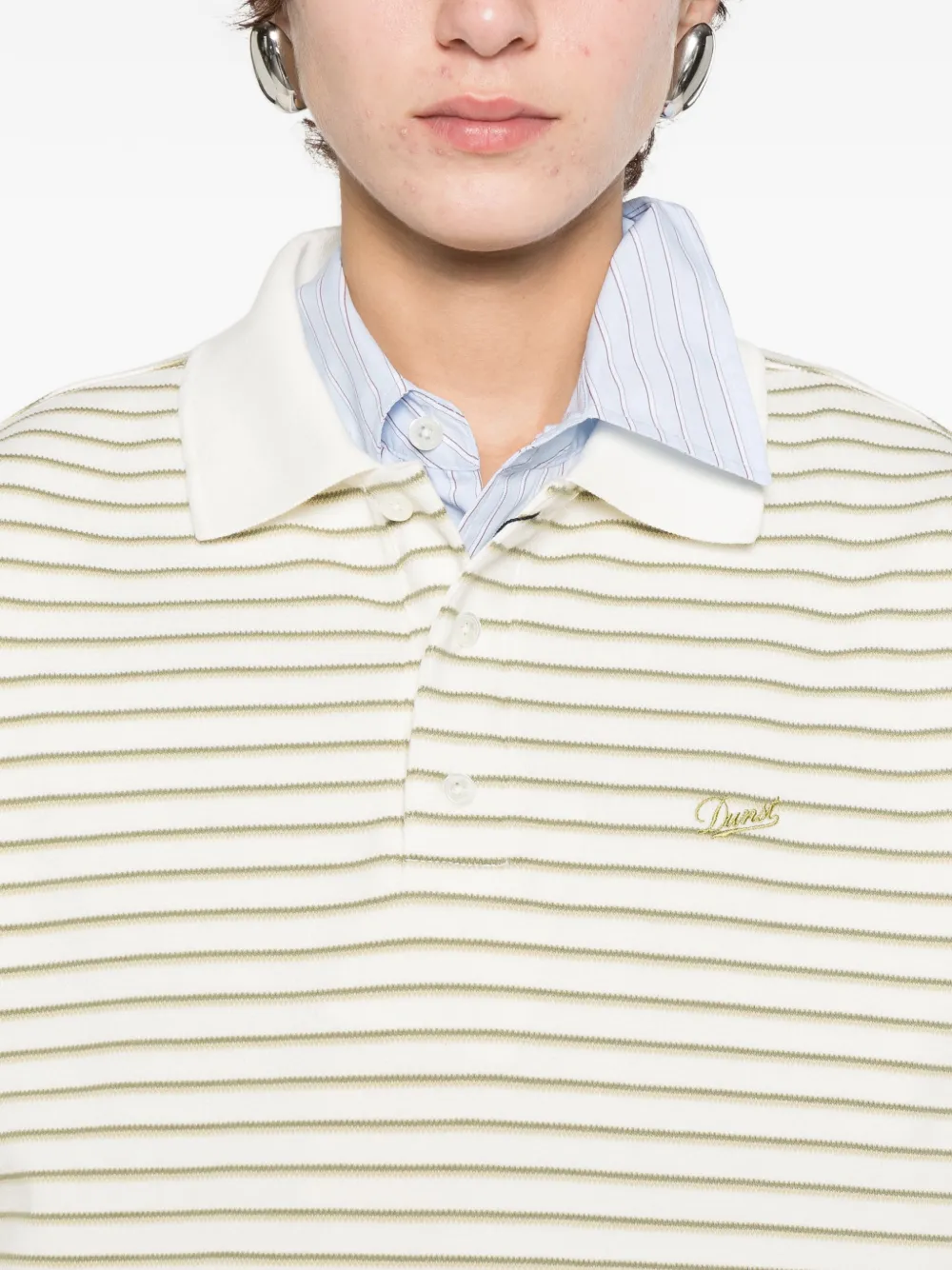 Белый и зеленый воротник в горизонтальную полоску, застежка на пуговицы спереди, декоративная деталь с логотипом
